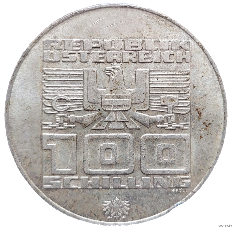 100 шиллингов 1975 XII зимние Олимпийские Игры, Инсбрук 1976 - Здания и Олимпийская эмблема! Серебро 24 грамма 640 пробы! ВОЗМОЖЕН ОБМЕН!