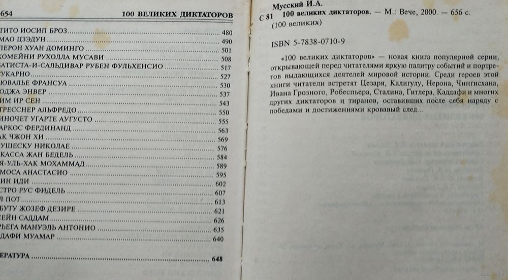 Большой формат. Тираж 30000 экз. 656 стр. 100 великих диктаторов - новая книга популярной серии, открывающей перед читателями яркую палитру событий и портретов выдающихся деятелей мировой истории. Среди героев этой книги читатели встретят Цезаря, Калигулу, Нерона, Чингисхана, Ивана Грозного, Робеспьера, Сталина, Гитлера, Каддафи и многих других диктаторов и тиранов, оставивших после себя наряду с победами и достижениями кровавый след...