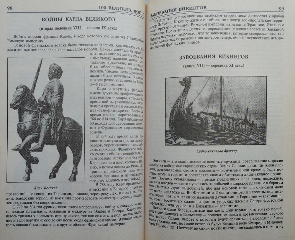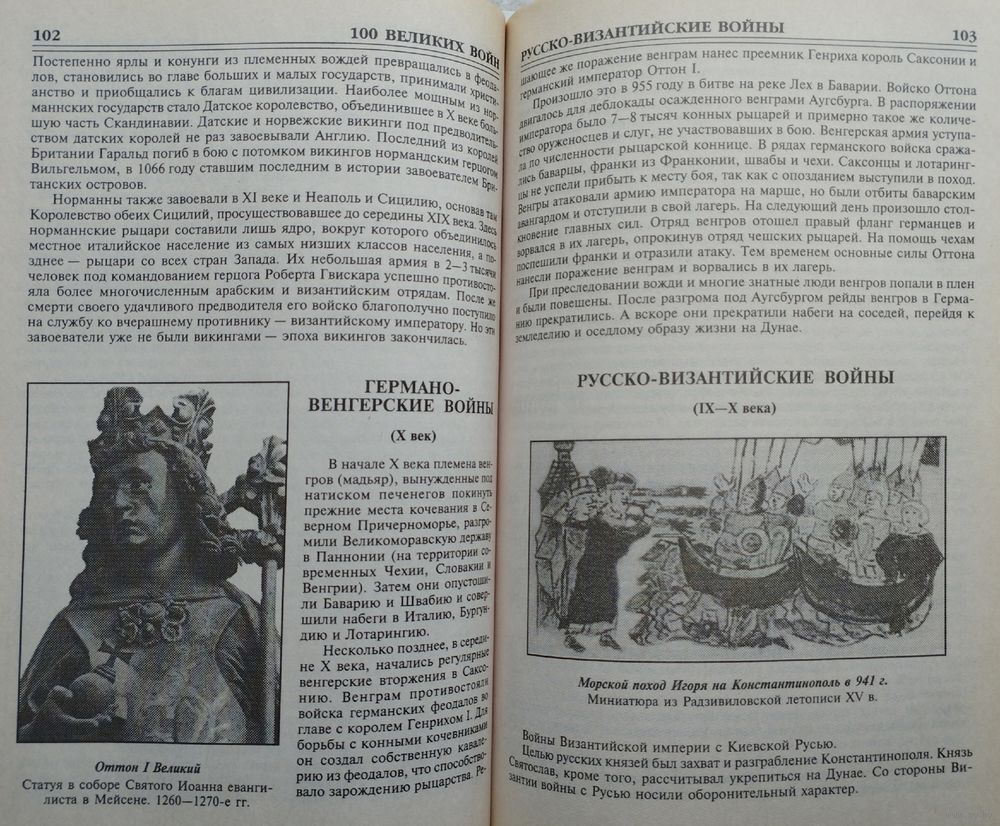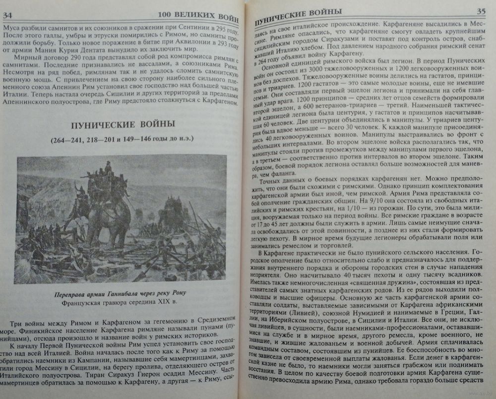 Большой формат. Тираж 3000 экз. 544 стр. Всю историю человечества, от первых цивилизаций Древнего Востока до наших дней, сопровождают войны. Вооруженные конфликты между государствами и народами полыхали на всех континентах, гражданские войны раздирали общества многих стран. Эта книга расскажет о ста самых великих войнах, об их причинах, ходе и последствиях. Полководческие таланты и бездарности, слава и бесчестие, триумфы и поражения, тяготы военных будней и надежды на мир… Поистине это вечные сюжеты для всех времен и народов!