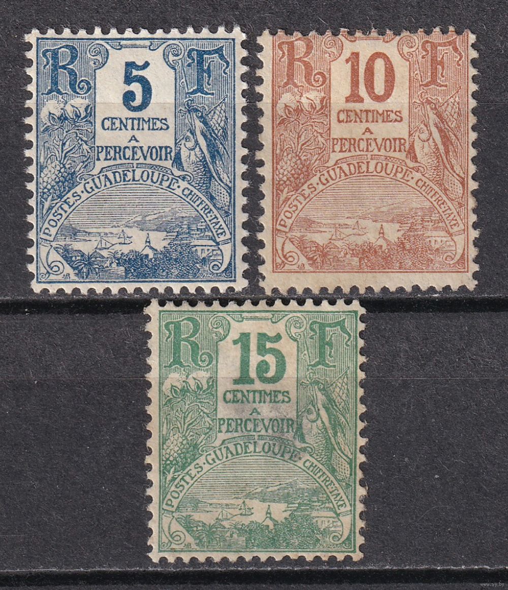 104.FrK. Франция. Колонии. Гваделупа. Доплатные марки. Порт Густавия. 1905 г. Mi.##15-17. (* - mi#16 повреждения клея, mi#17 тонкое место по центру).