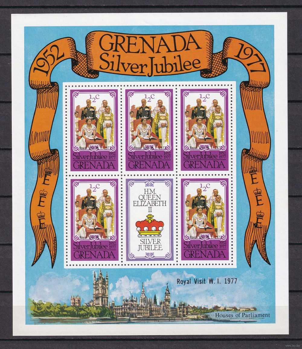 11.BrKS. Великобритания. Колонии. Гренада. Серебряный юбилей Елизаветы II. Надпечатка. Королевский визит 1977 г. 1/2C. Mi.#851C. Малый лист. MNH. (Формат - 17 см. Х 14,5 см.).