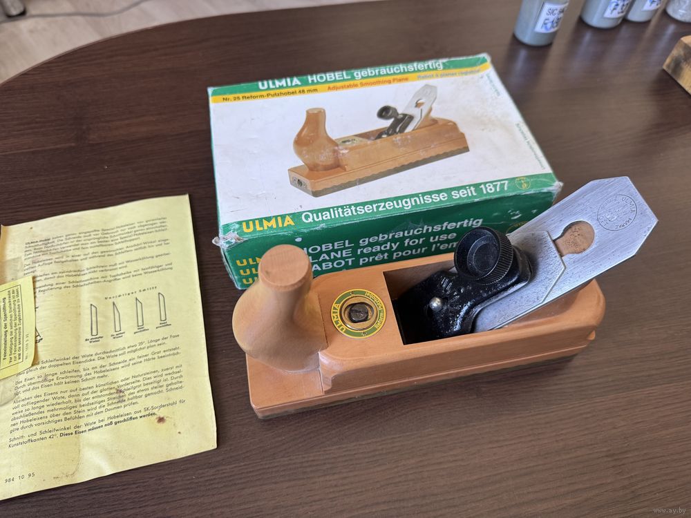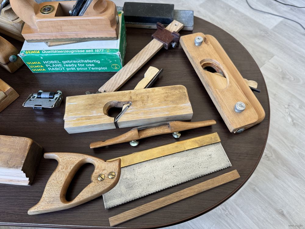 Среди рубанков, два рубанка производства ULMIA (западногерманский бренд с 1877г.), два рубанка производства HOWAL (столярная фабрика ГДР). Длинный рубанок с ножом от компании I. Sorby из Шеффилда, Англия, (известна с нач. 19 в., клеймо на ноже "I. SORBY CAST STEEL").