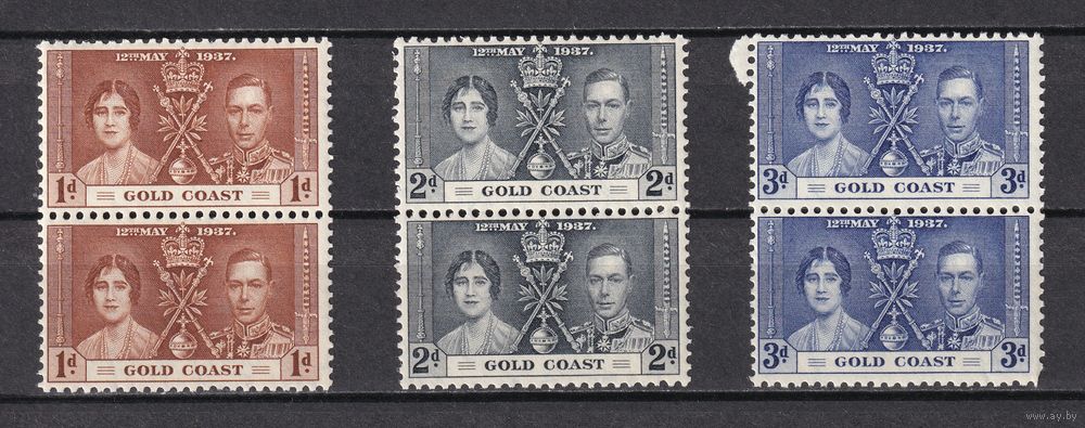 Золотой Берег. Коронация Георга VI и Елизаветы. 1937 г. Полная серия. Пары. Mi.##102-104. MNH.