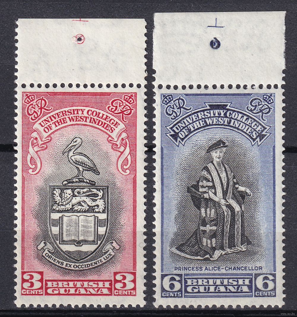 139.BrKS. Великобритания. Колонии. Британская Гвиана. Открытие Ямайского университета для британских колоний в Вест - Индии. 1951 г. Полная серия. MNH. Mi.##196-197.
