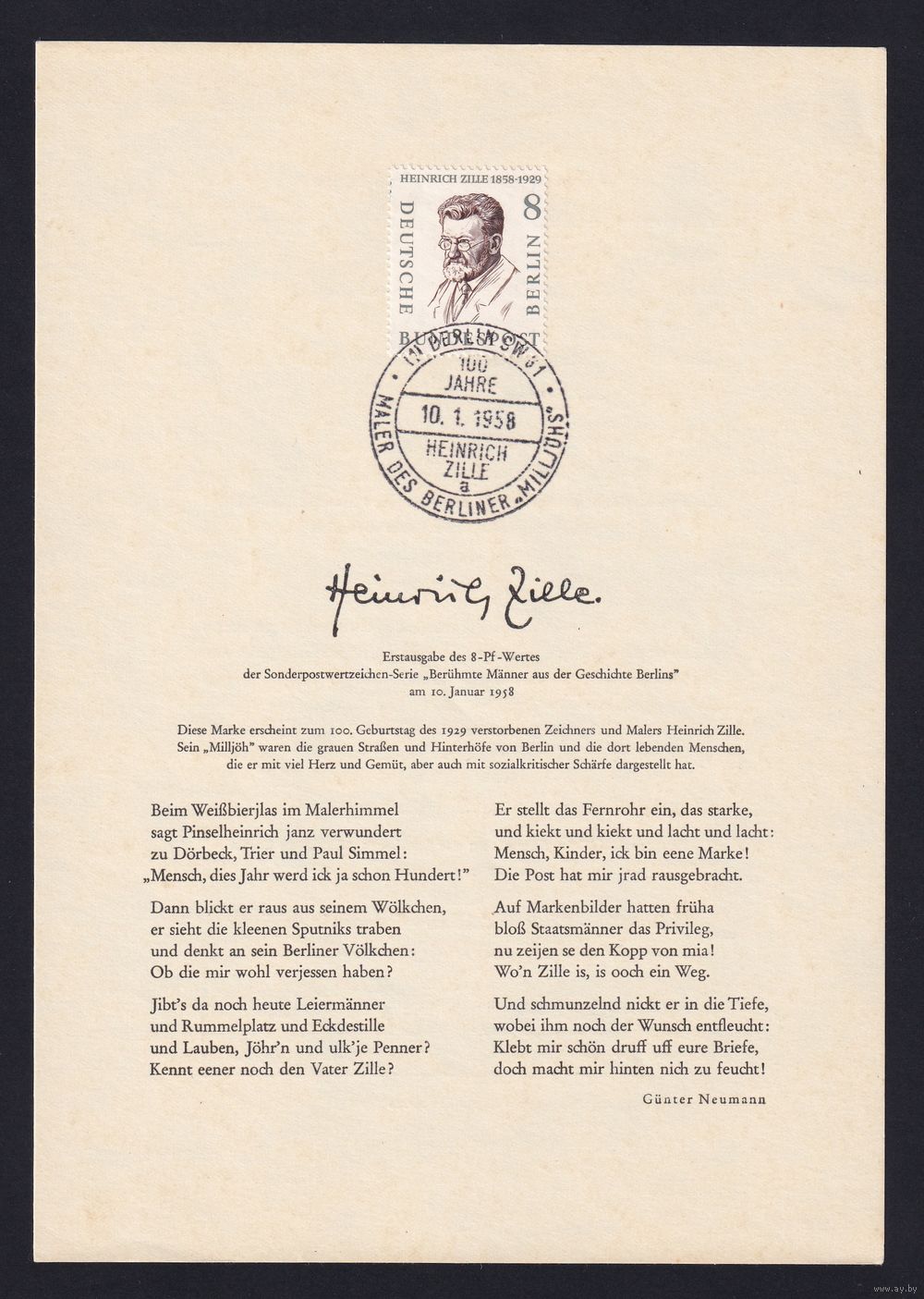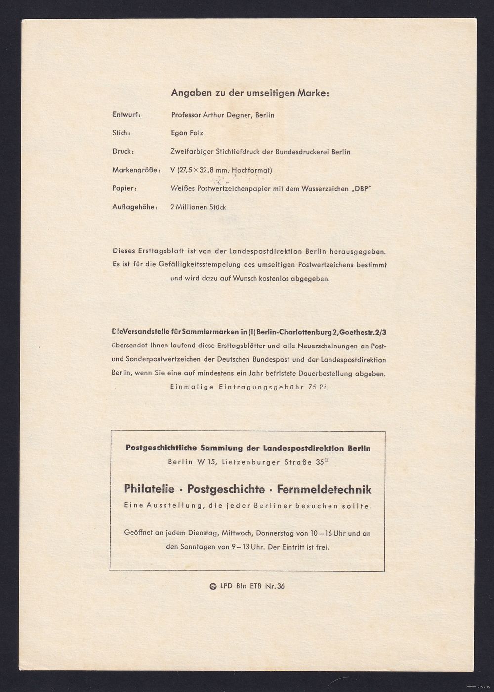 14.ETB. Германия. Западный Берлин. 1957 г. Люди из истории Берлина. Лист первого дня гашения. Mi.#164/ETB#36.