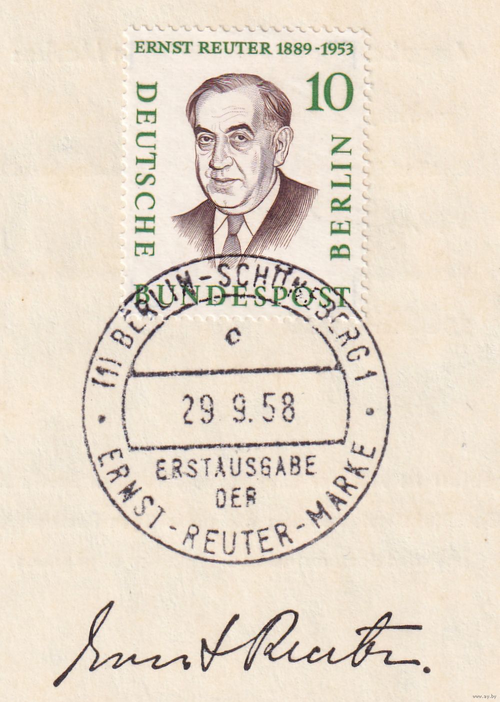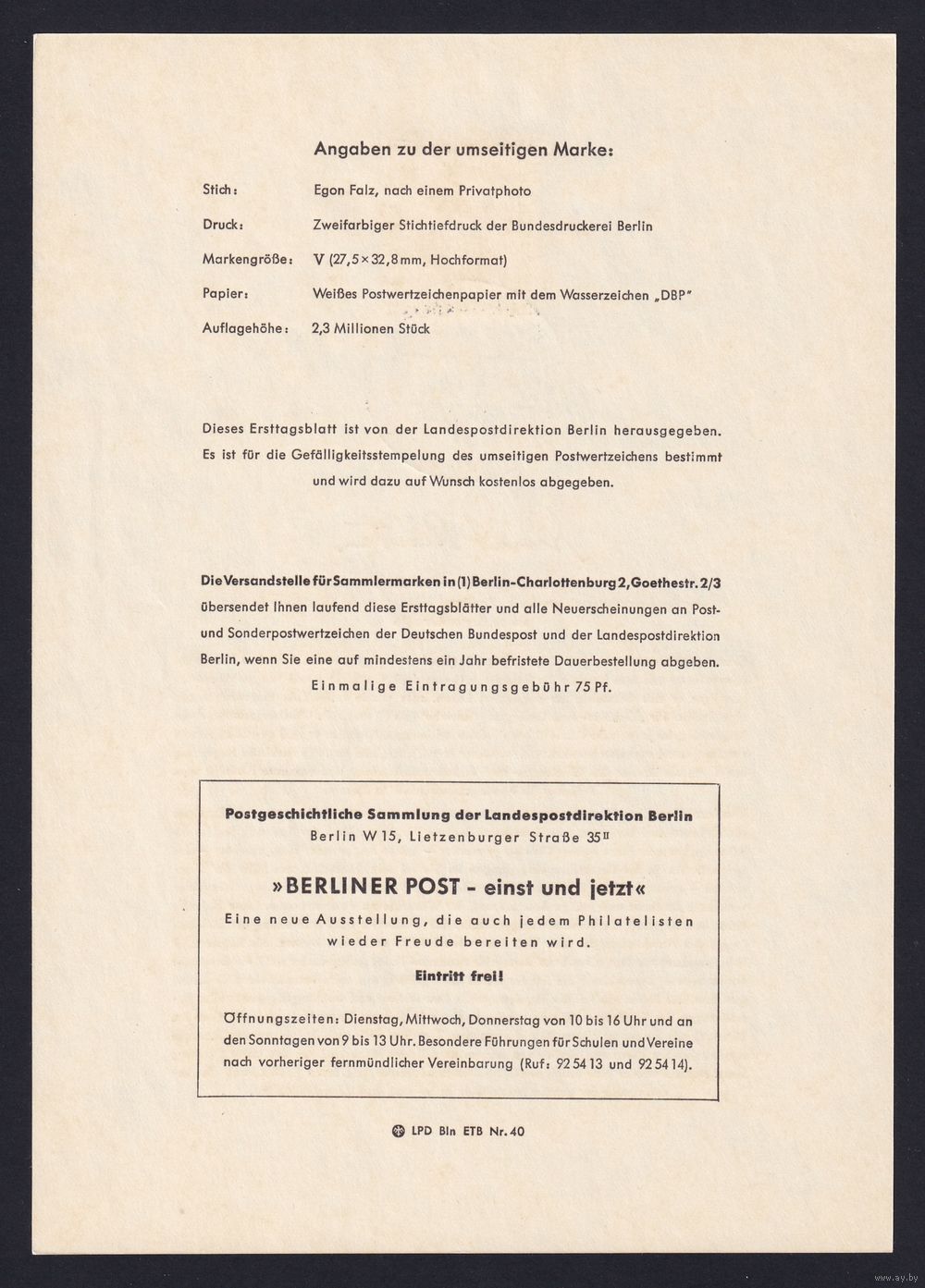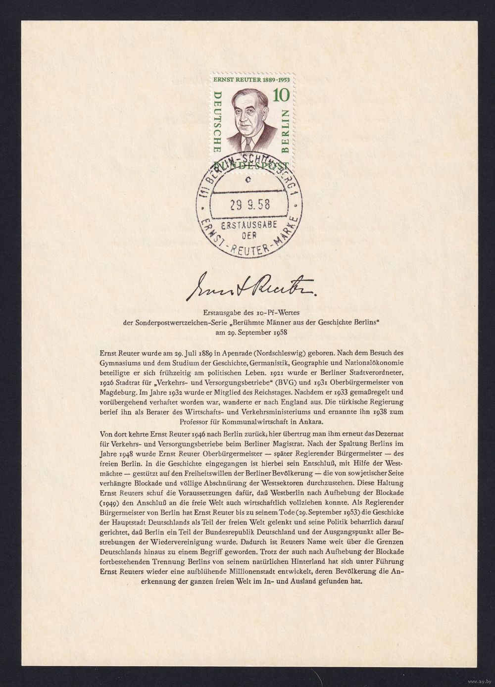 15.ETB. Германия. Западный Берлин. 1957 г. Люди из истории Берлина. Лист первого дня гашения. Mi.#165/ETB#40.