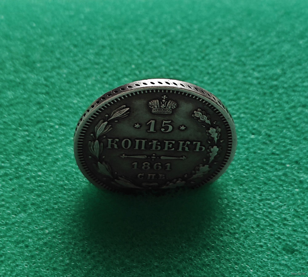 Перед нами монета 15 копеек, выпущенная в 1861 году Санкт-Петербургским монетным двором (СПБ), в 1861 году введена в обращение.