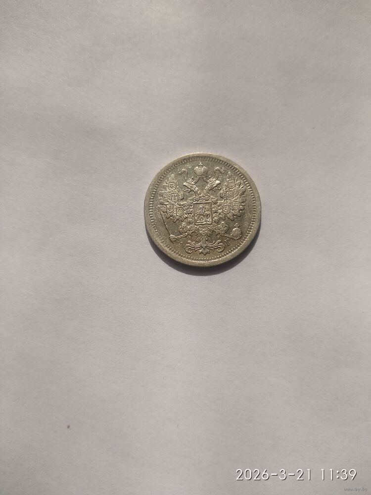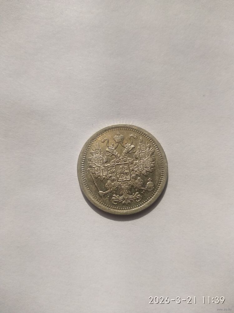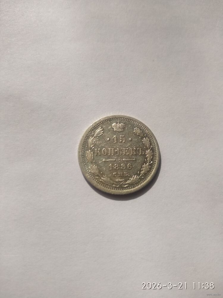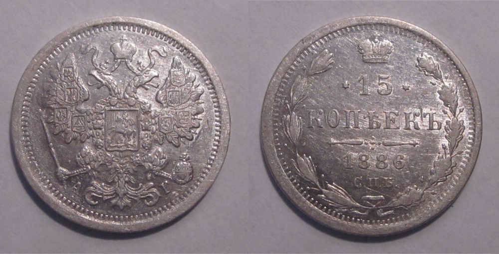 Реверс: слева вдоль края монеты лавровая ветвь, справа дубовая, внизу ветви соединяются и перевязаны лентой, в середине вверху Корона Российской империи, под ней обрамленный слева и справа звездочками номинал монеты - цифра «15», ниже слово «КОПЕЕК», под ним две направленные в разные стороны фигурные черты и ниже год выпуска монеты «1886», под ним обозначение монетного двора «СПБ».