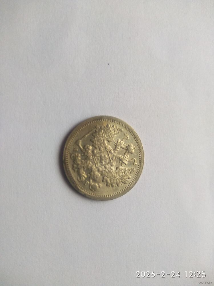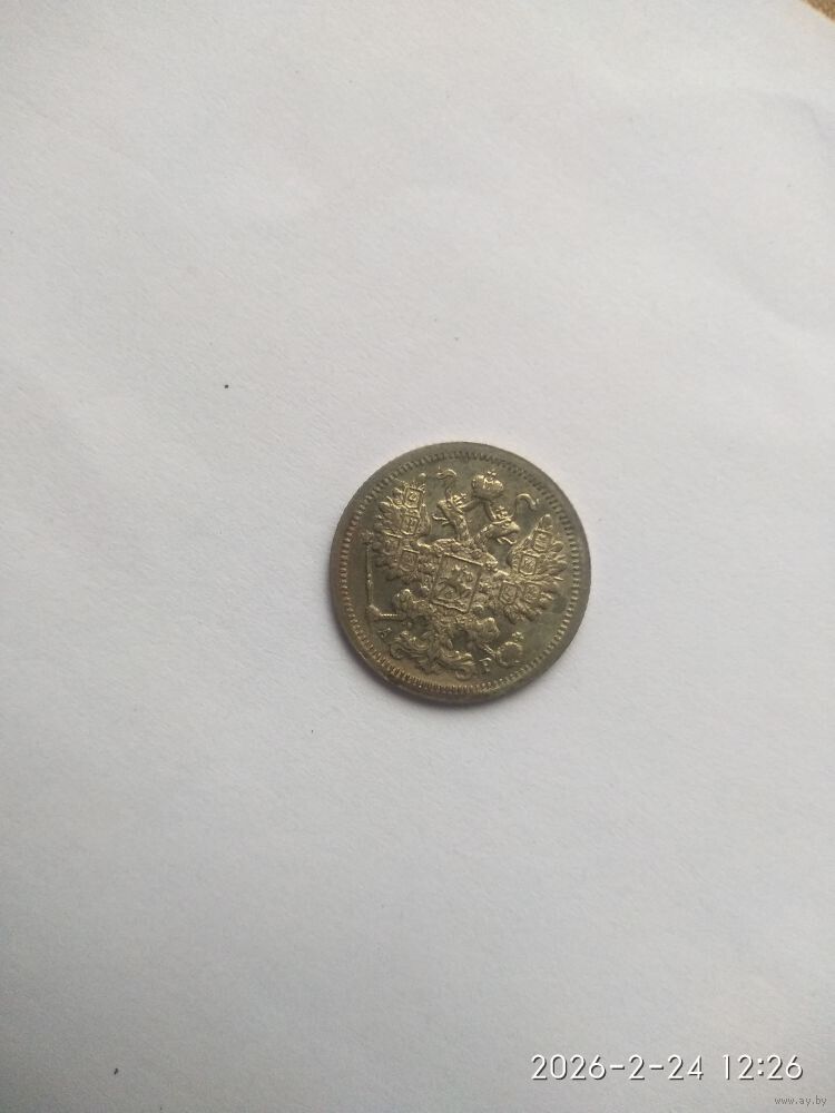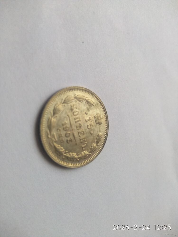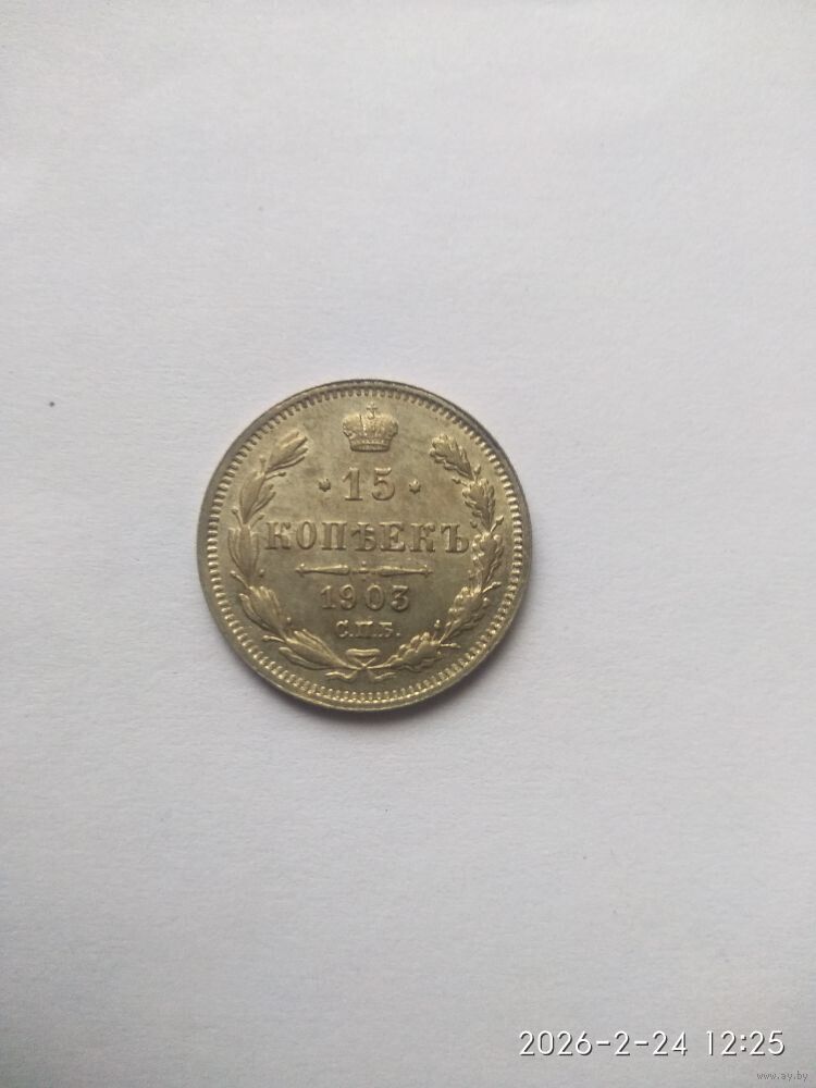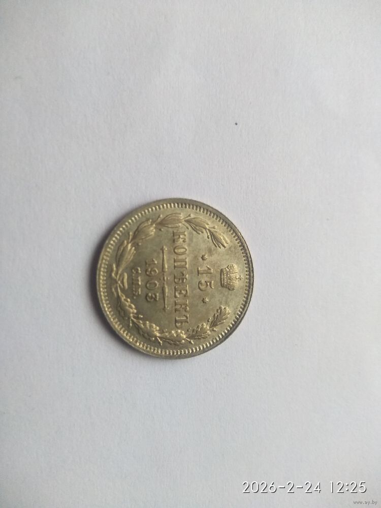 Реверс: слева вдоль края монеты лавровая ветвь, справа дубовая, внизу ветви соединяются и перевязаны лентой, в середине вверху Корона Российской империи, под ней обрамленный слева и справа звездочками номинал монеты - цифра «15», ниже слово «КОПЕЕК», под ним две направленные в разные стороны фигурные черты и ниже год выпуска монеты «1903», под ним обозначение монетного двора «СПБ».