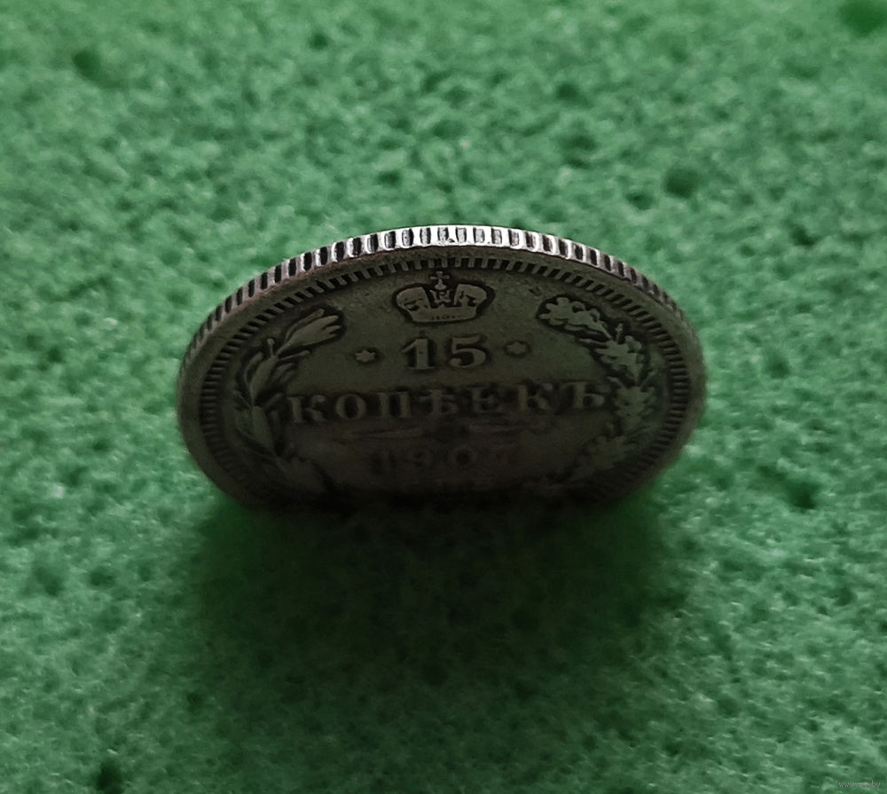 Перед нами монета 15 копеек, выпущенная в 1907 году Санкт-Петербургским монетным двором (СПБ), в 1907 году введена в обращение.