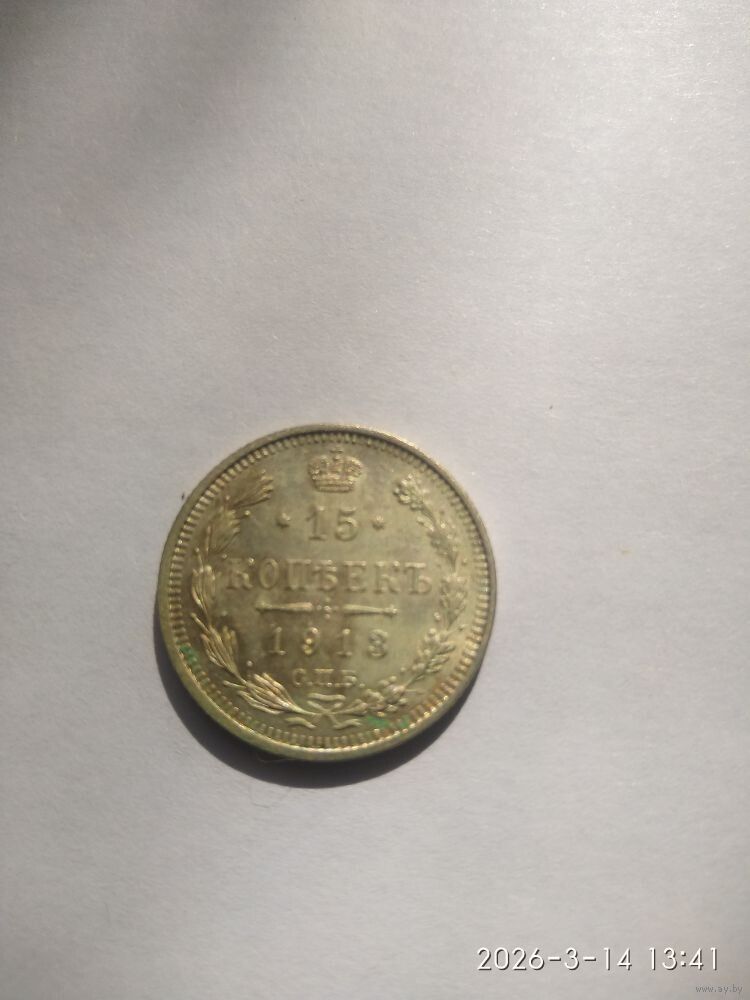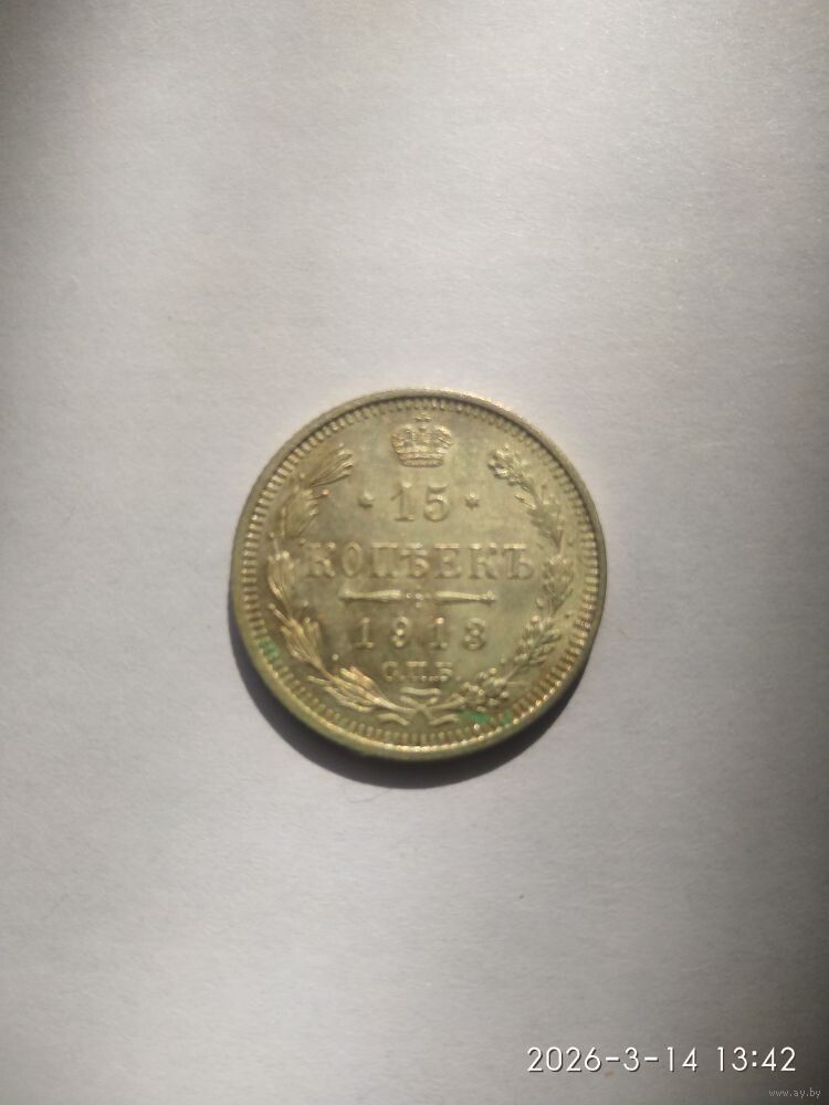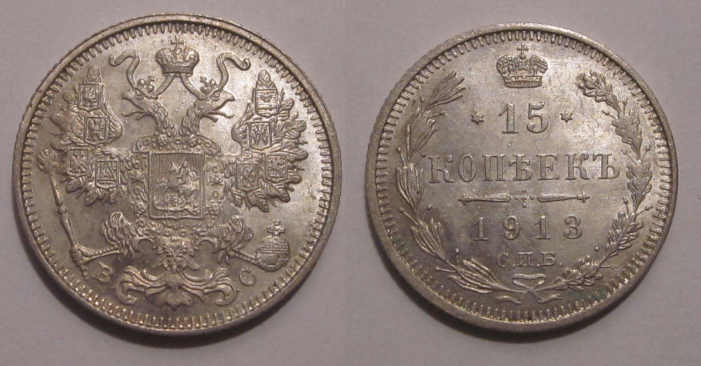 Реверс: слева вдоль края монеты лавровая ветвь, справа дубовая, внизу ветви соединяются и перевязаны лентой, в середине вверху Корона Российской империи, под ней обрамленный слева и справа звездочками номинал монеты - цифра «15», ниже слово «КОПЕЕК», под ним две направленные в разные стороны фигурные черты и ниже год выпуска монеты «1913», под ним обозначение монетного двора «СПБ».