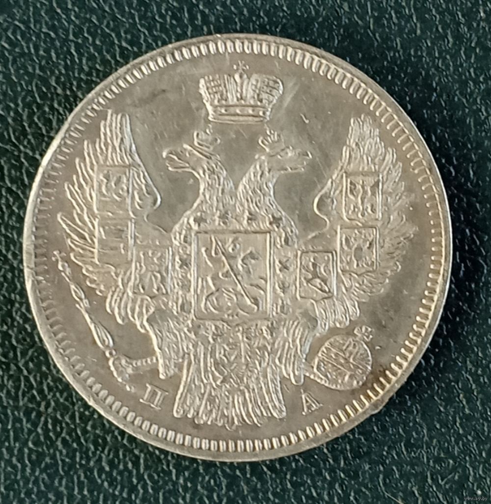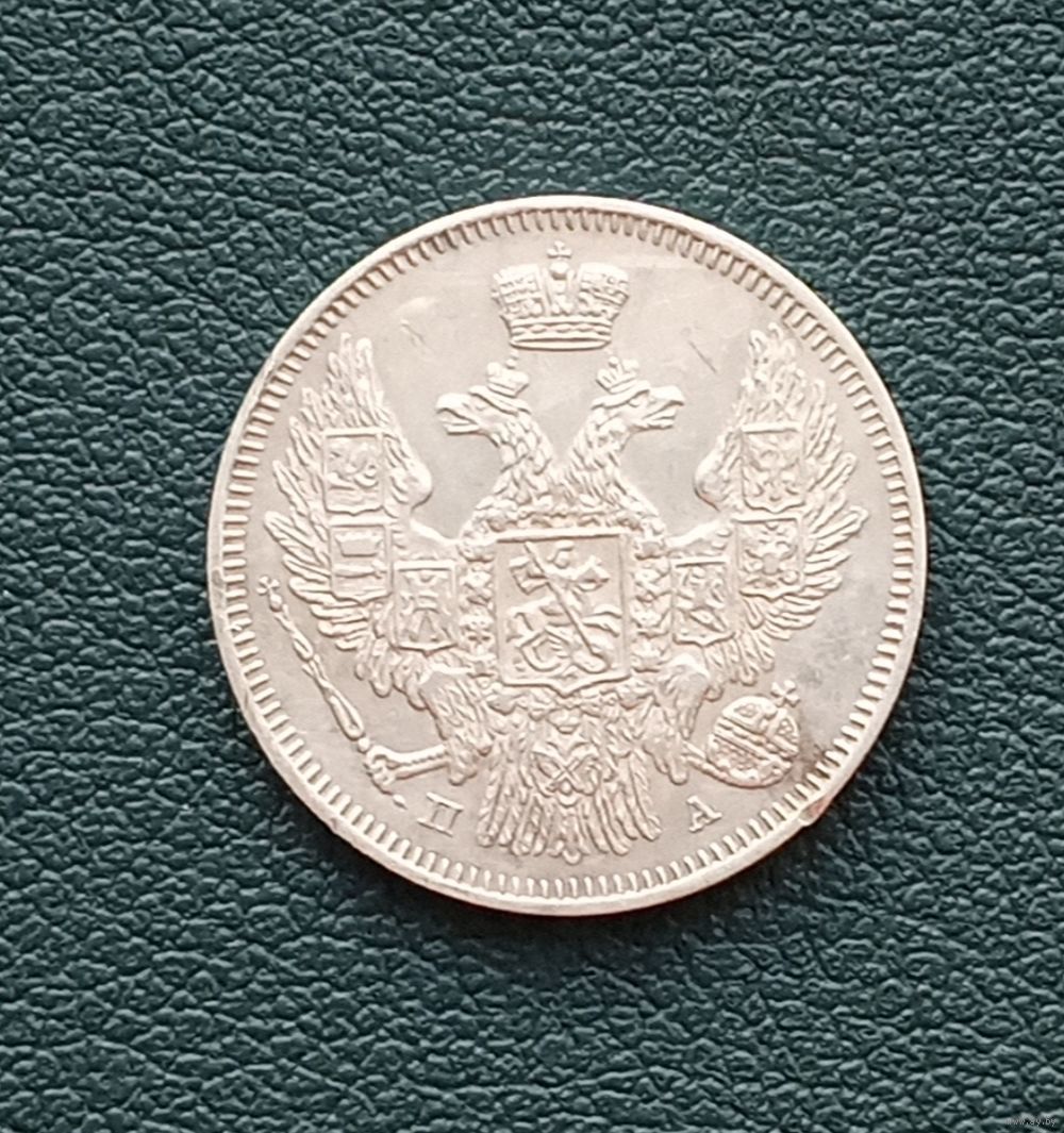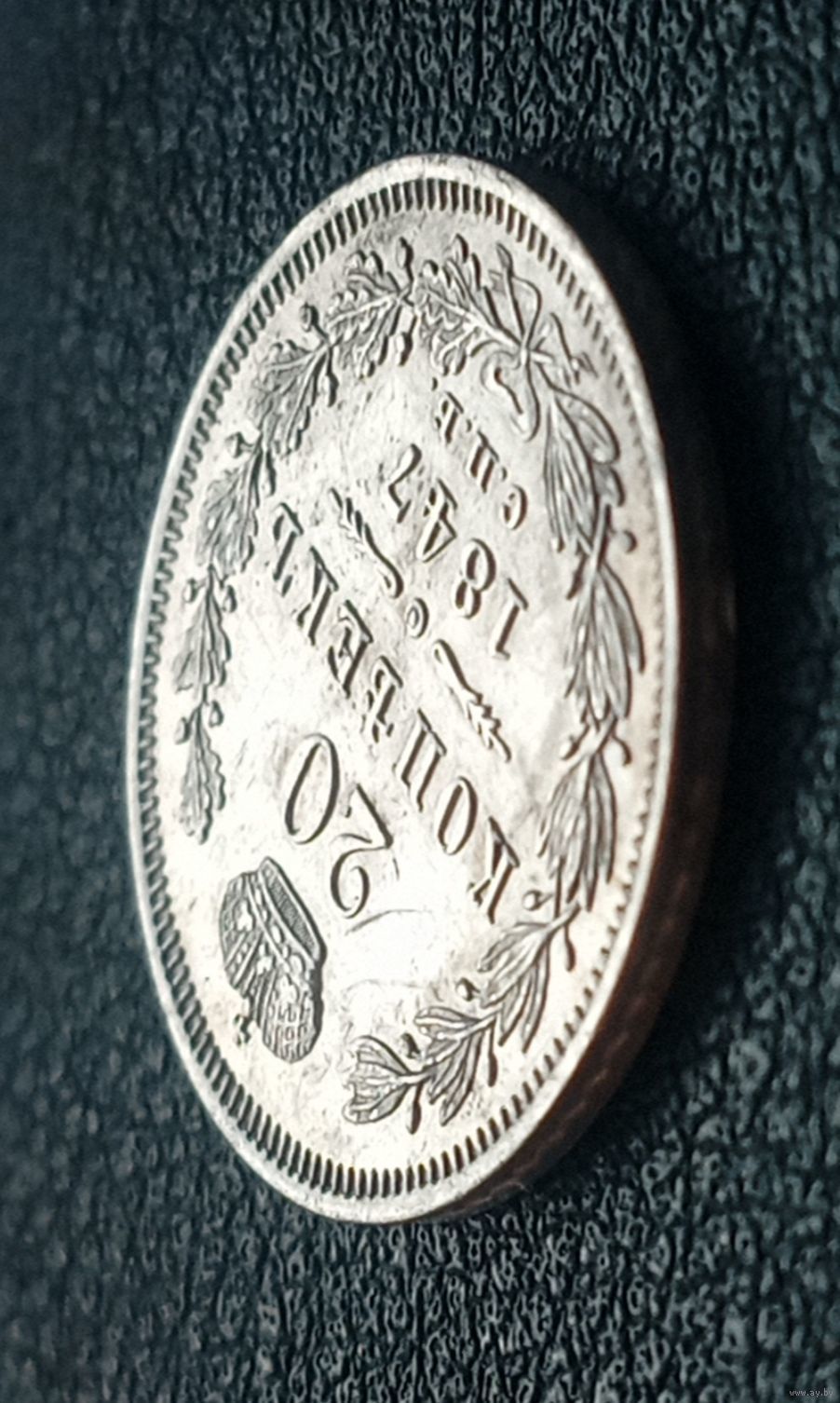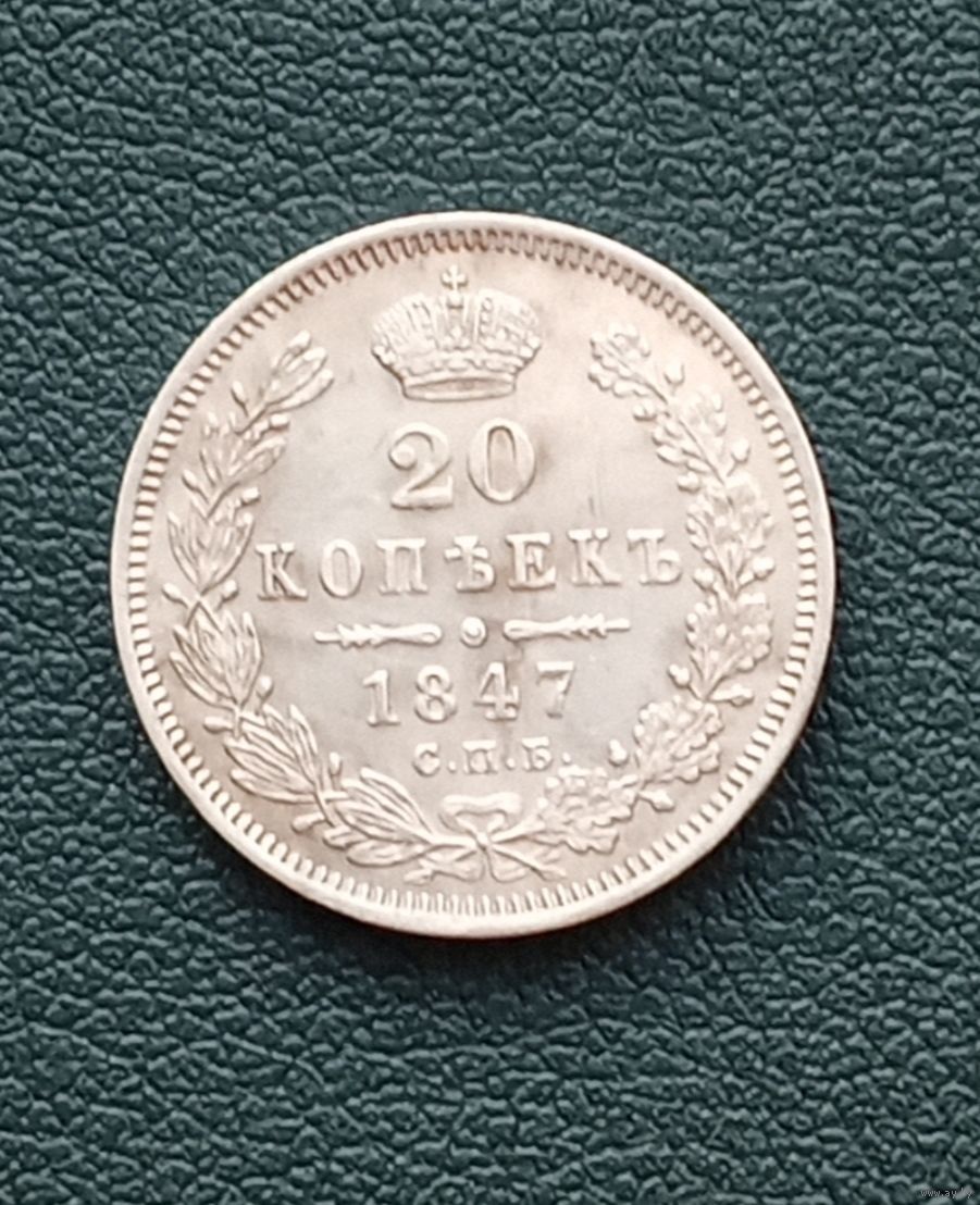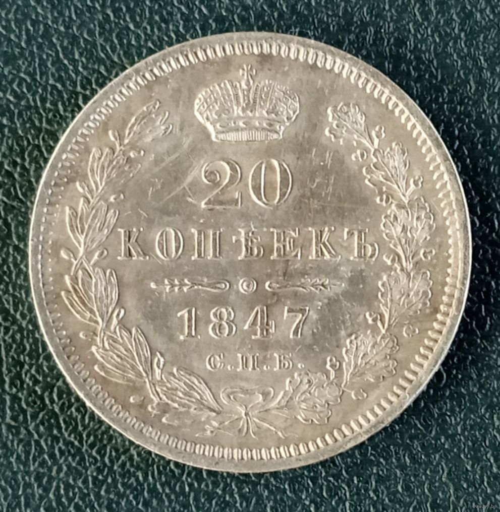 Аверс: В верхней части Реверс:а расположена корона Российской империи. Ниже на двух строках обозначен номинал и денежная единица : 20 КОПѢЕКЪ Далее следует элемент-разделитель, состоящий из двух разнонаправленных линий с окантованной точкой между ними. Немного ниже фигурного разделителя расположен год чеканки монеты «1847», под которым аббревиатура «С.П.Б.» (Санкт-Петербургский монетный двор). В левой части монеты вдоль края находится лавровая ветвь, а в правой дубовая. У основания ветви скреплены лентой, узел которой образует бант. По всему краю монеты отчеканены выступающие зубцы.