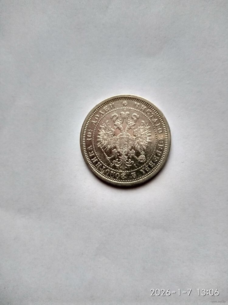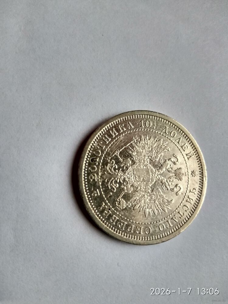 Аверс: В центре указан номинал «ПОЛТИНА». Над номиналом – Корона Российской империи. Под номиналом расположен декоративный разделитель в виде двух разнонаправленных фигурных линий и небольшой выпуклой точки между ними. Под разделителем — год чеканки «1877». Под годом — аббревиатура «С.П.Б.» (Санкт-Петербургский монетный двор). В левой части монеты вдоль края находится лавровая ветвь, а в правой дубовая. У основания ветви связаны лентой, которая образует аккуратный бант. По всему краю монеты отчеканены выступающие зубцы.