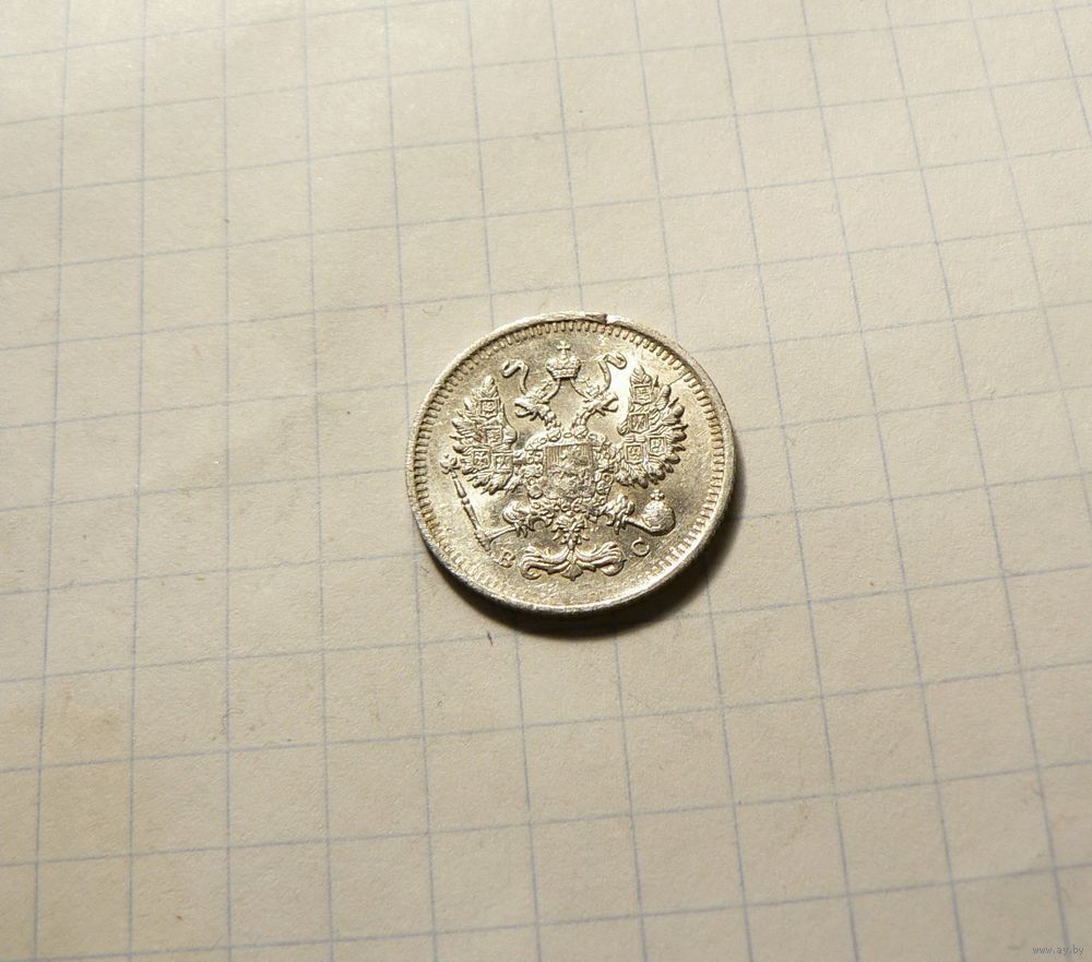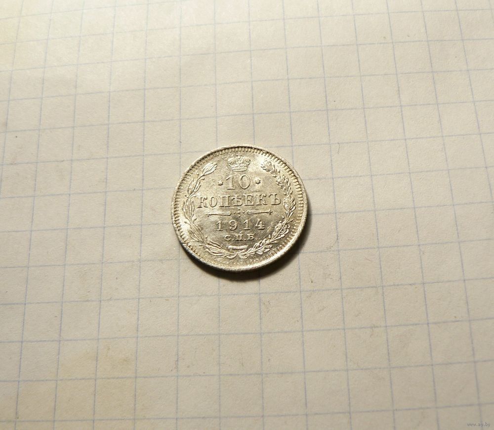 РеверсВ центре указан номинал «10», ограниченный с обеих сторон звездочками. Над цифрой — Корона Российской империи. Под цифрой номинала — слово «КОПЕЕК». Ниже, расположен декоративный разделитель в виде двух разнонаправленных фигурных линий и стилизованным из точек крестом между ними. Под разделителем — дата выпуска монеты «1914». Под цифрой даты — обозначение монетного двора «С.П.Б.». Вдоль канта, не доходя до короны, изображен венок из лавровой и дубовой ветви, которые в нижней части перевязаны лентой на узел бантом. По окружности канта имеются рельефные элементы, выполненные в виде зубцов.