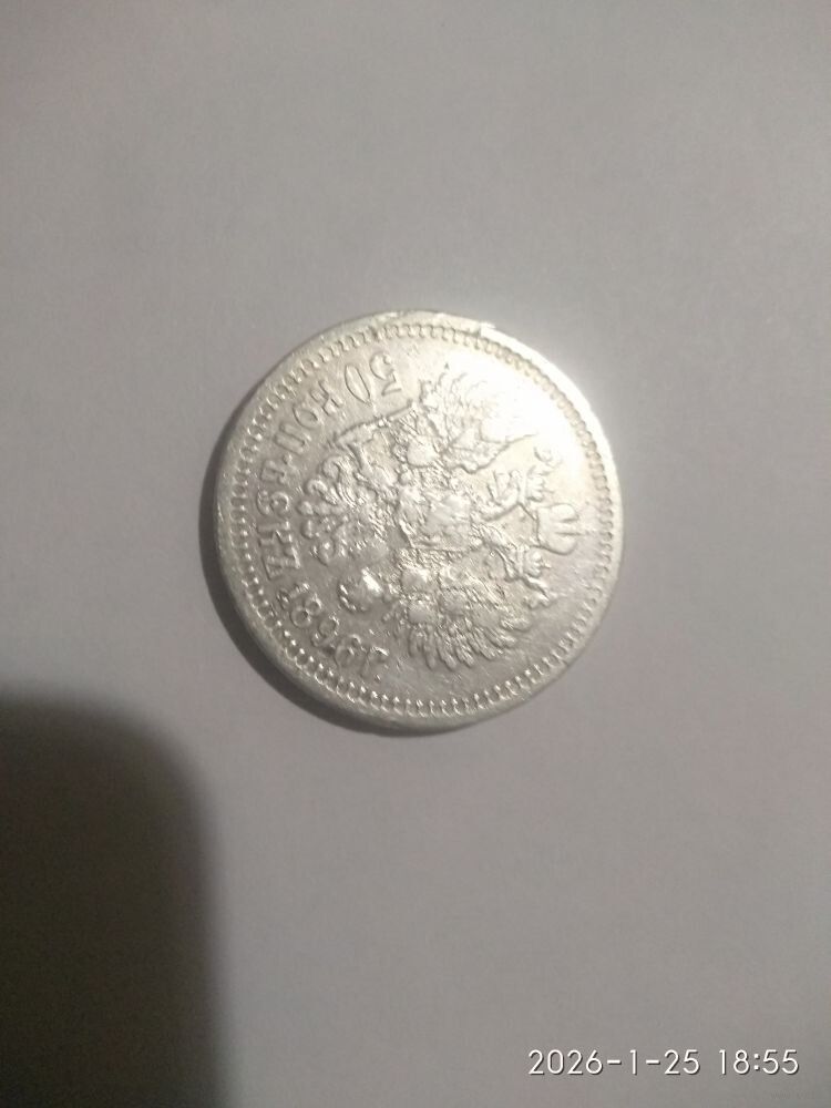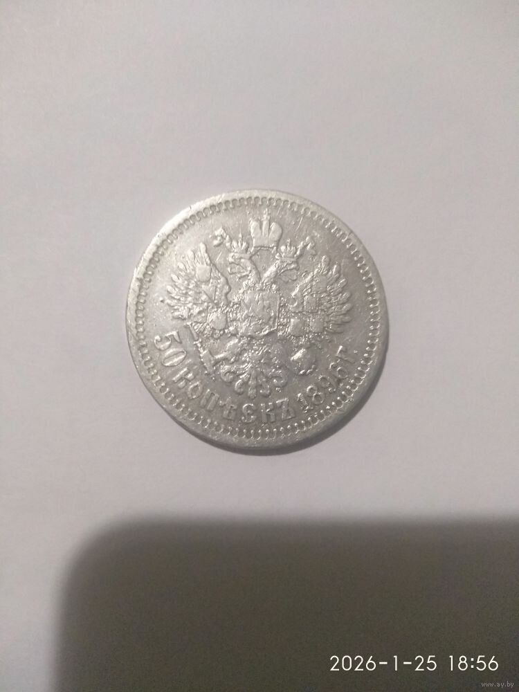 Аверс: в середине Малый Государственный Герб Российской империи, под ним вдоль края монеты слева номинал «50 КОПЕЕК», в середине цветочная розетка, справа выпуска монеты «1896 Г.».