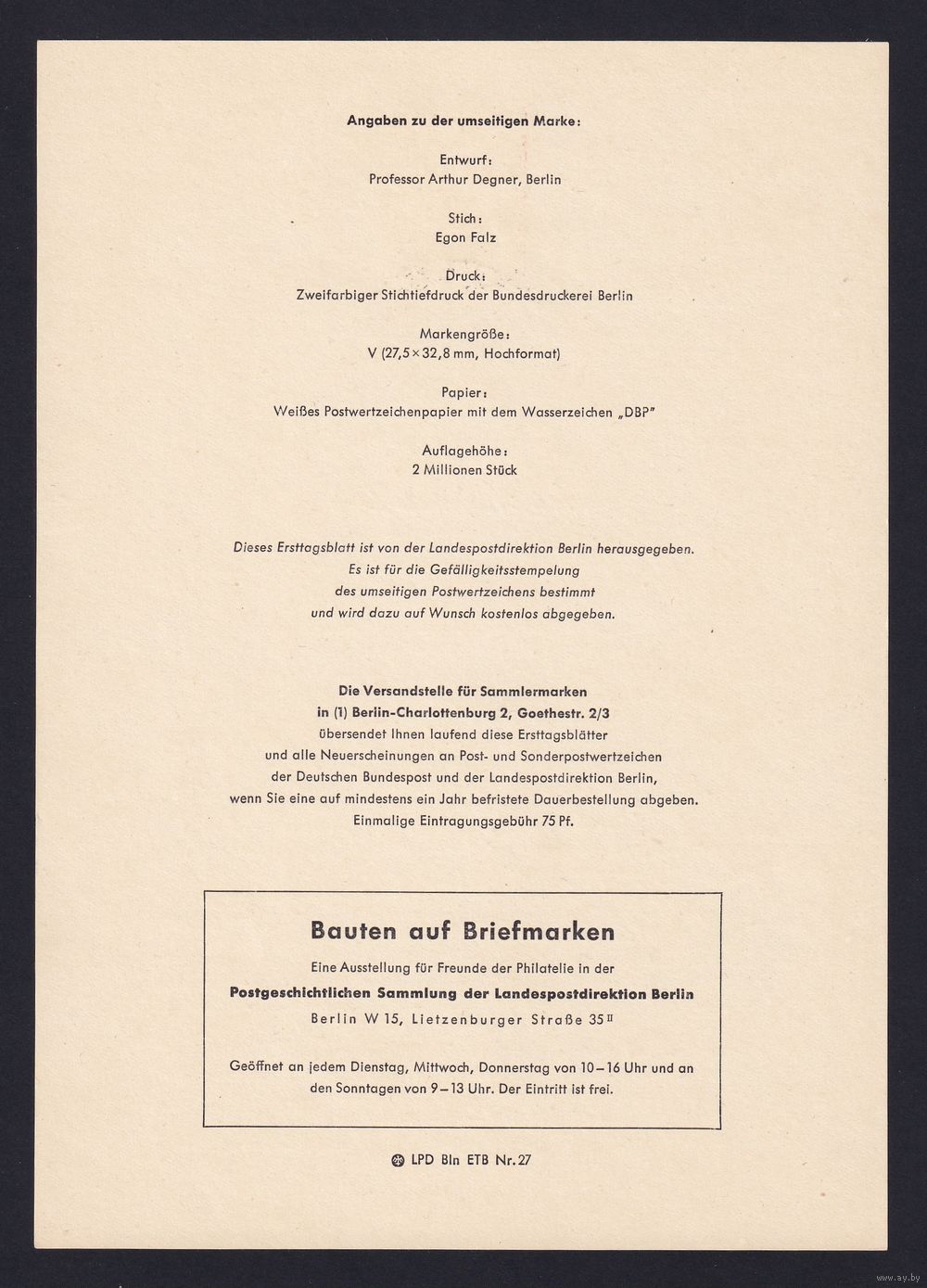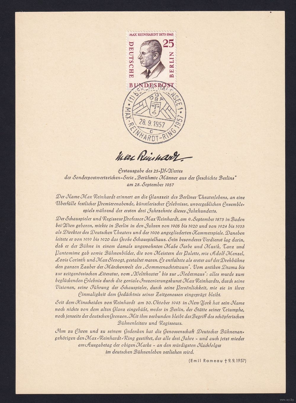 19.ETB. Германия. Западный Берлин. 1957 г. Люди из истории Берлина. Лист первого дня гашения. Mi.#169/ETB#27.