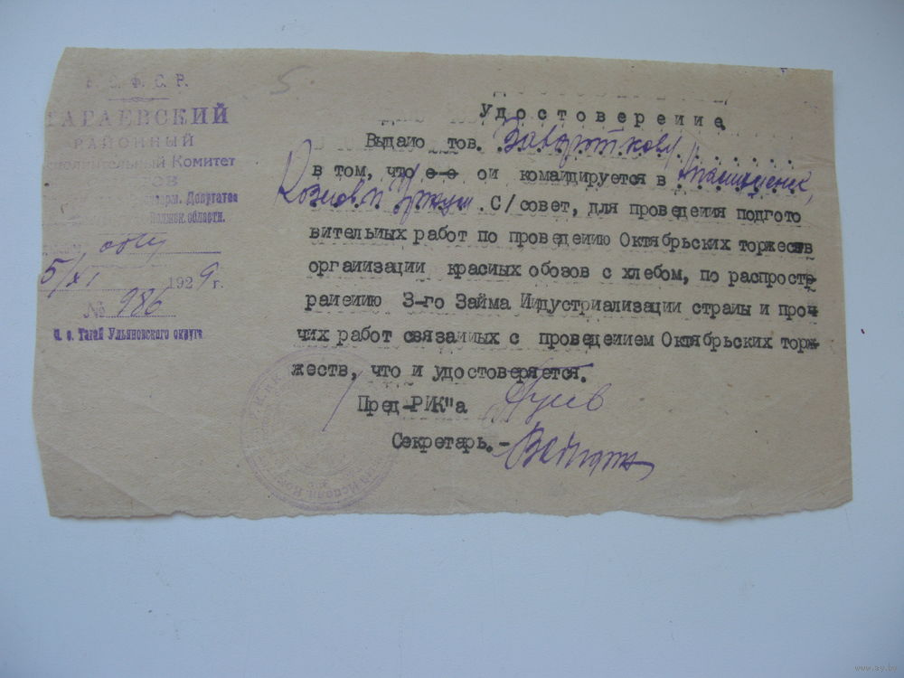 1929 г. КПСС Удостоверение по организации красных обозов с хлебом и др.