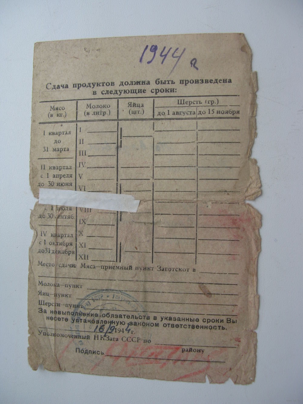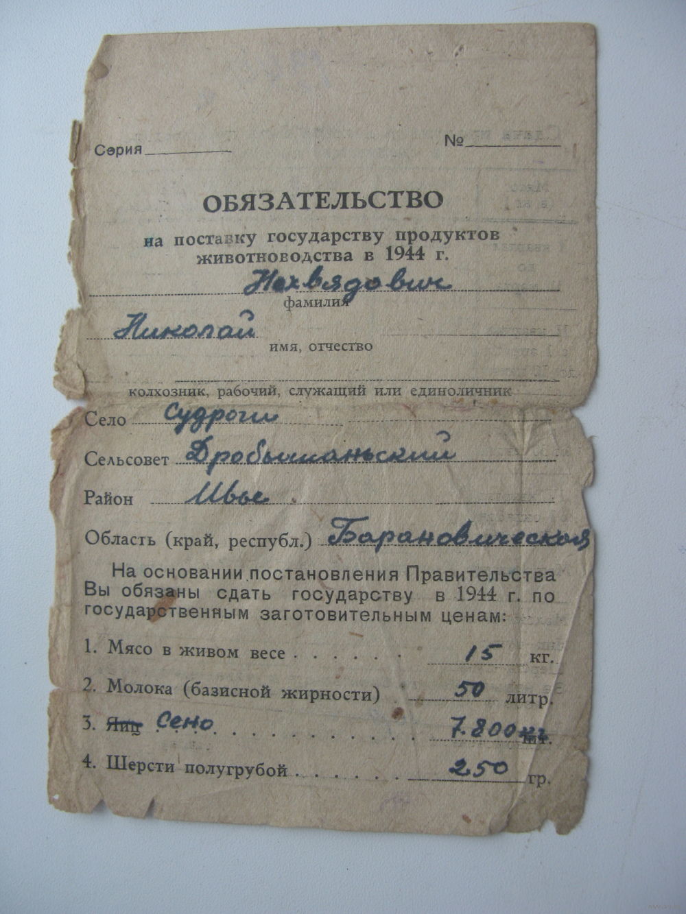 1944 г. Обязательство по поставке гос-ву продуктов животноводства
