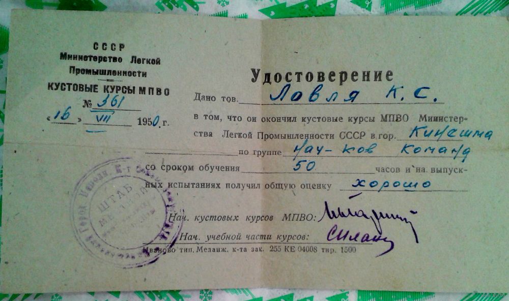 1950г. Удостоверение об окончании кустовых курсов МПВО