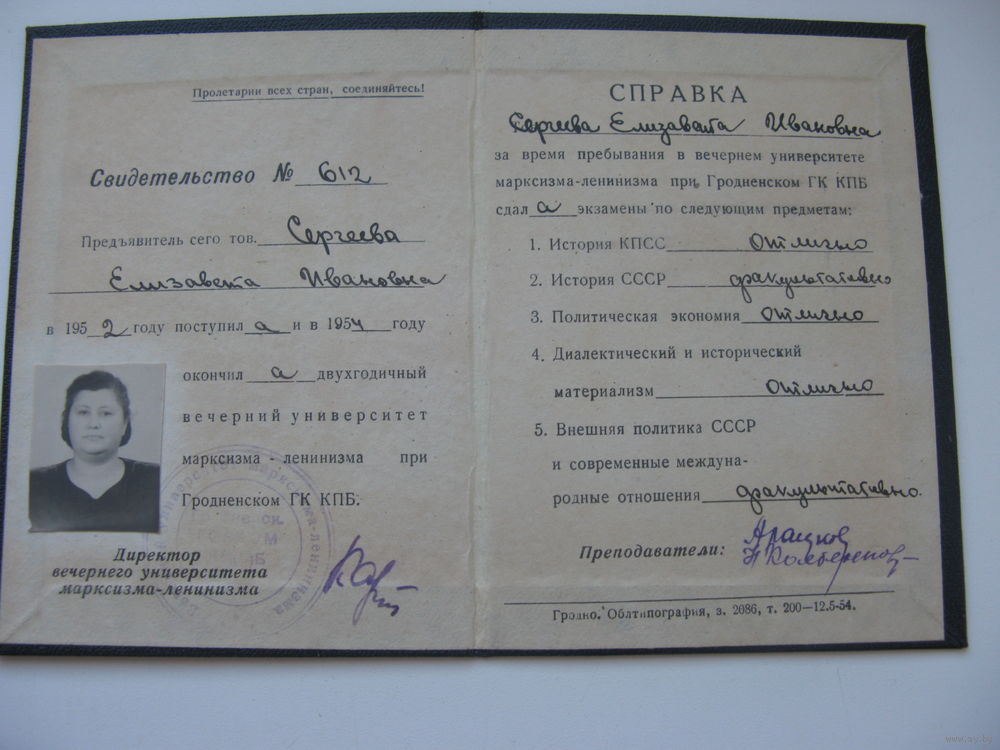 1954 г. КПСС Свидетельство о окончании вечернего университета марксизма - ленинизма