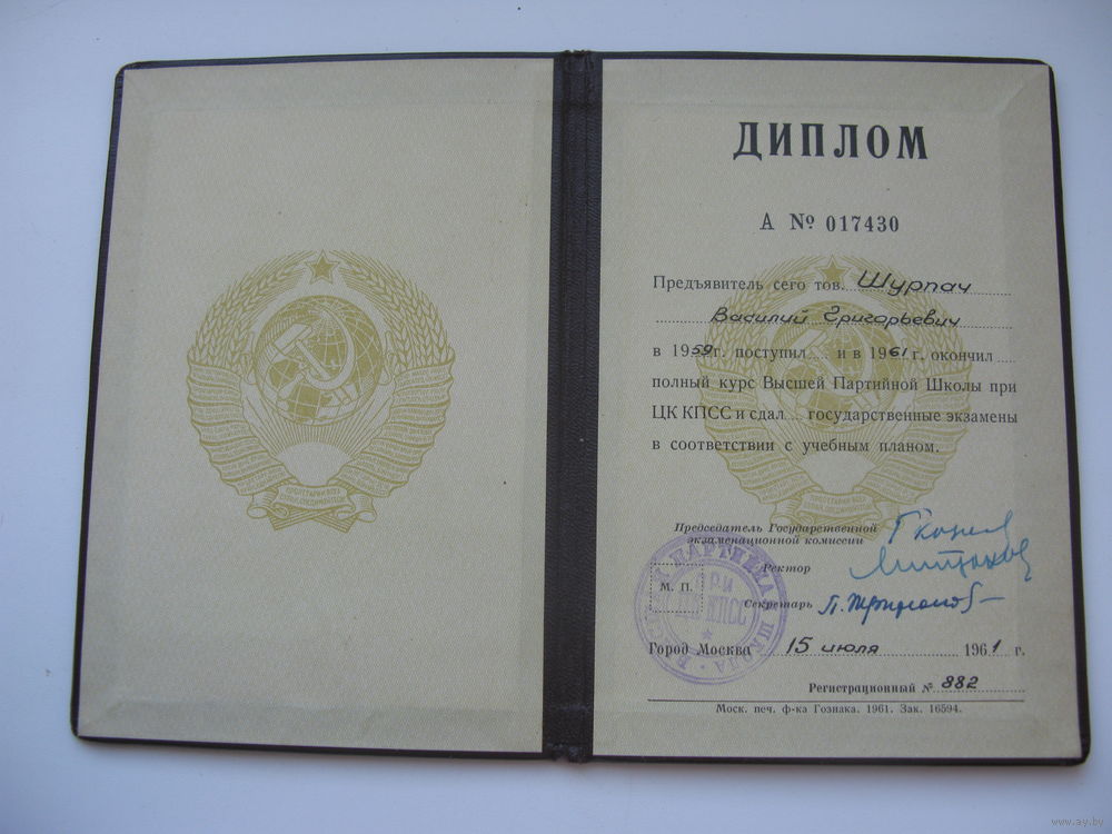 1961г. КПСС . Диплом Высшей Партийной Школы