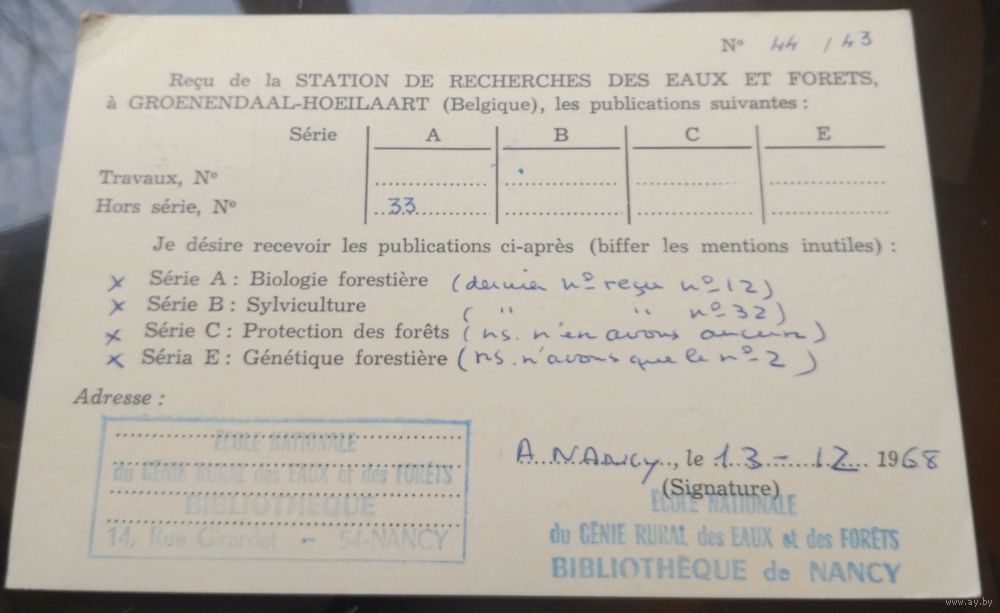 1968 год Франция Научно-исследовательская станция водных и лесных ресурсов