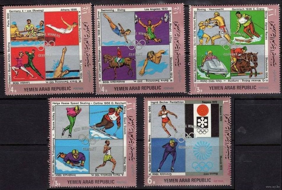 1970 Йемен YAR 1269-1273 Олимпийские игры 1972 года в Мюнхене, надпечатка серебро 6,00 евро