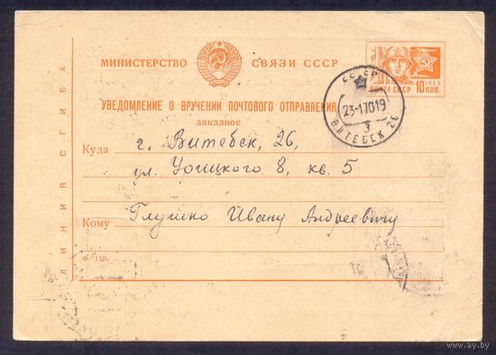 1970 СССР Витебск-Черкасская область ПК уведомление о вручении