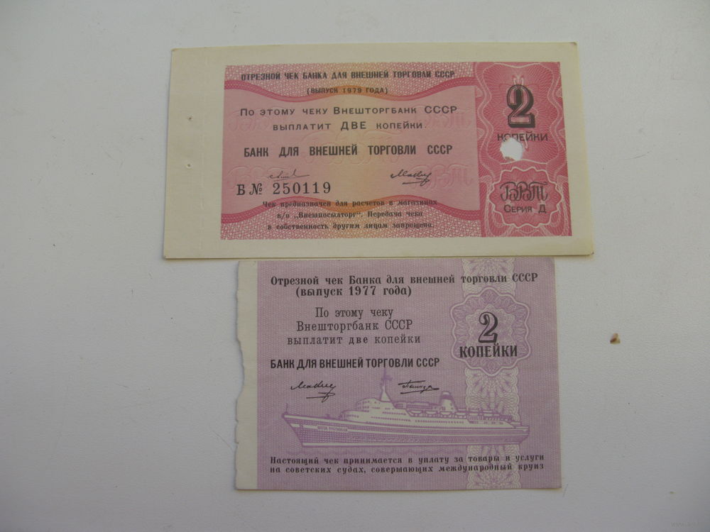 1973 г. 1977 г. Чеки банка для внешней торговли СССР " Торгмортранс " 2 копейки