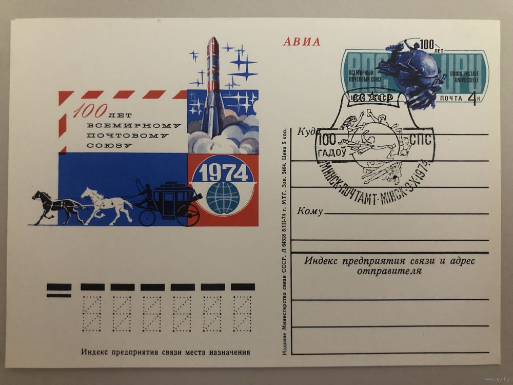 1974 ПК с ОМ со СГ. 100 лет Всемирному почтовому союзу (#018)