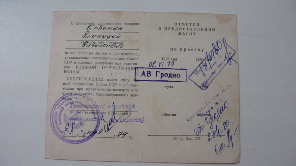 1979 г. Удостоверение . Право на льготы г. Гродно