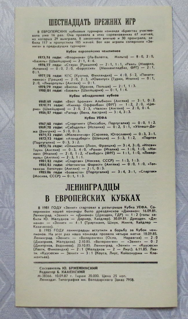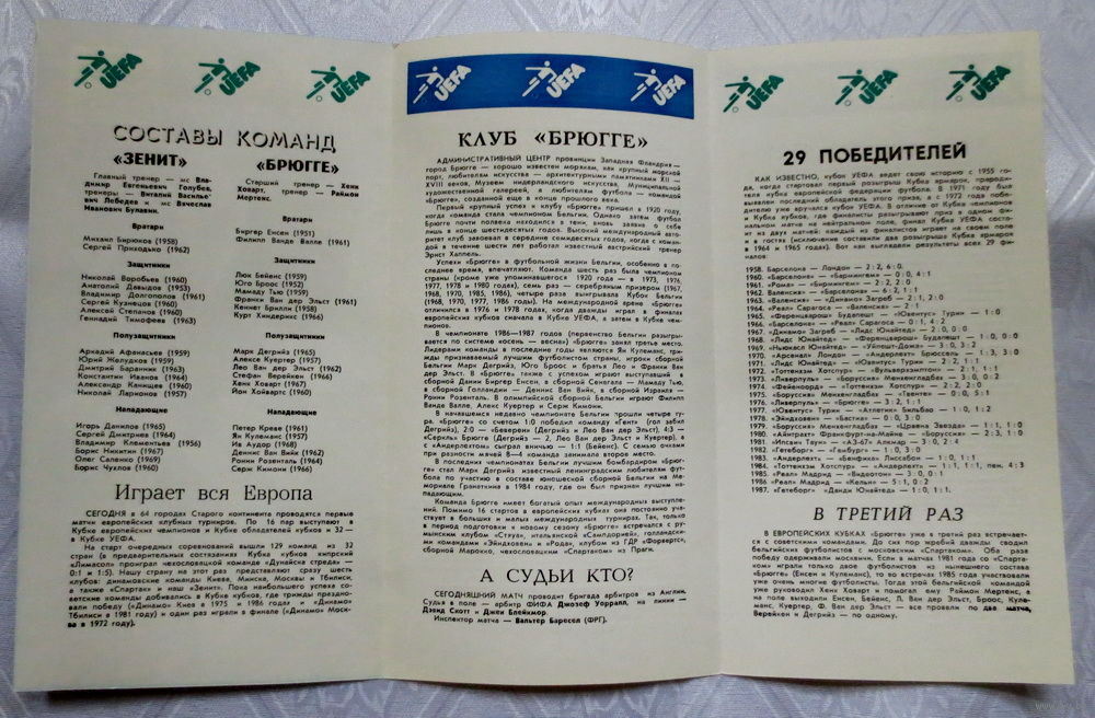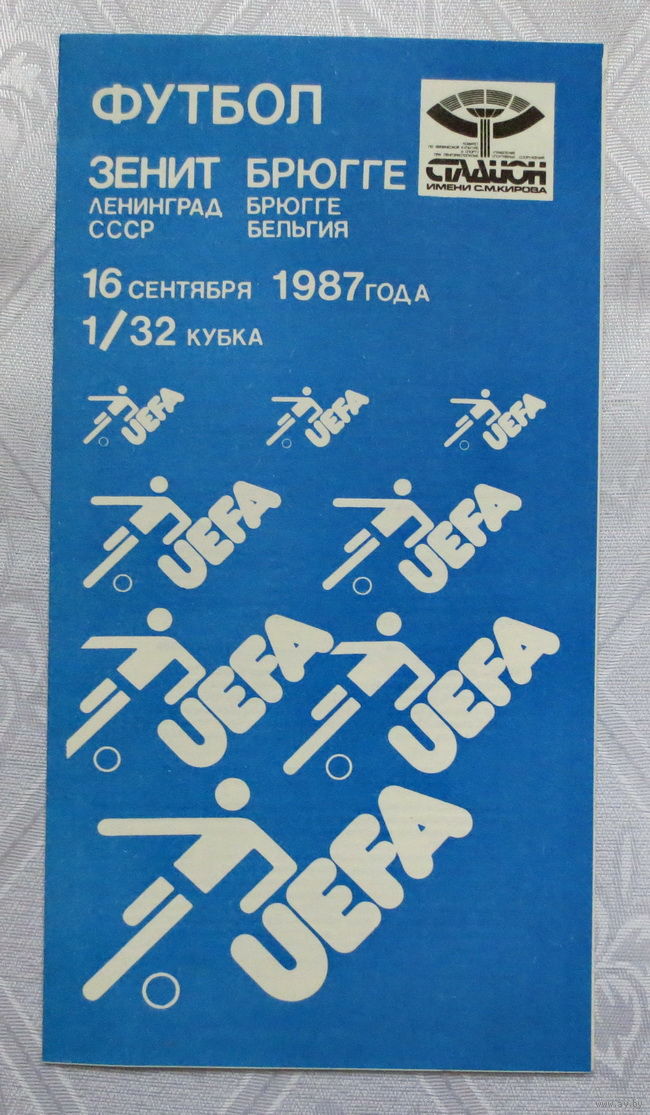 1987 год. Футбол, Кубок УЕФА, 1/32кубка. Матч 16.09.1987 г. "Зенит" Ленинград, СССР - "Брюгге" Брюгге, Бельгия. Отличное состояние.