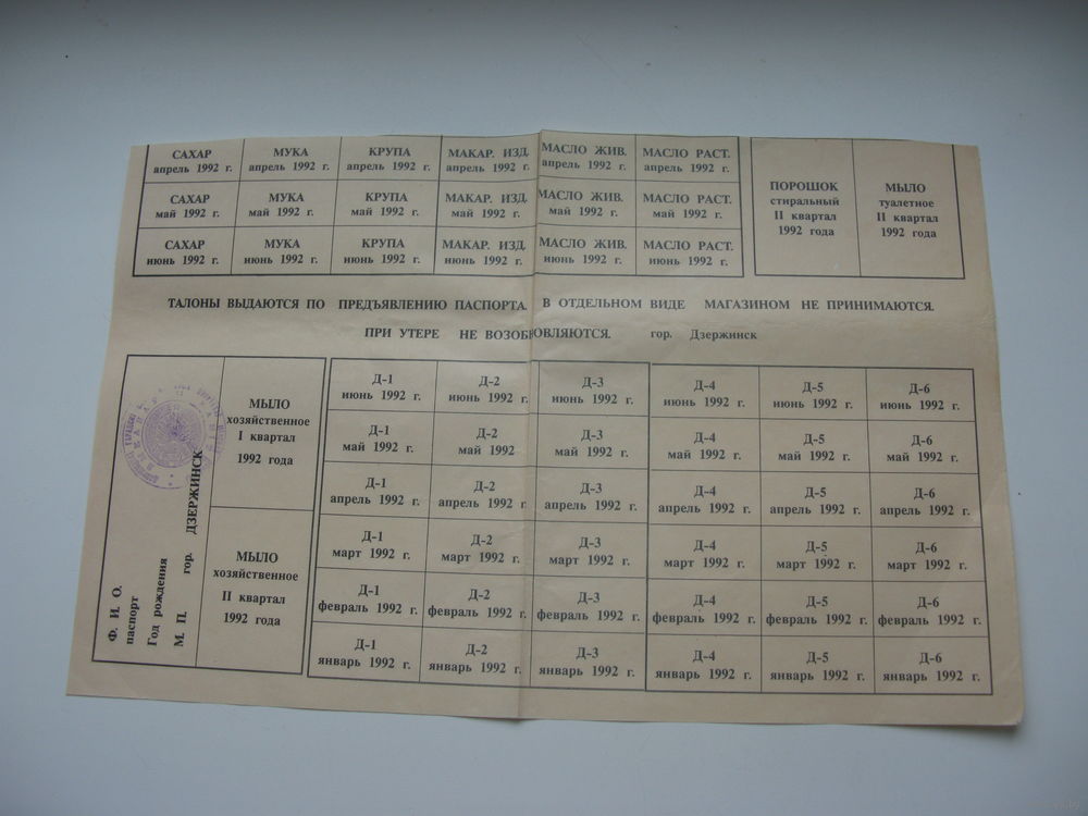 1992 г. Талоны на продукты и мыло г. Дзержинск