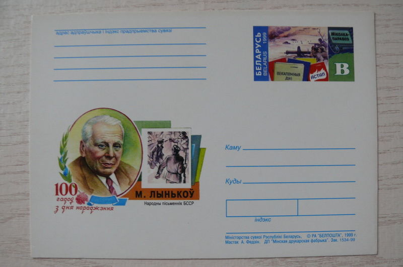 1999, Беларусь, ПК с ОМ; Лыньков М., 100 лет со дня рождения.