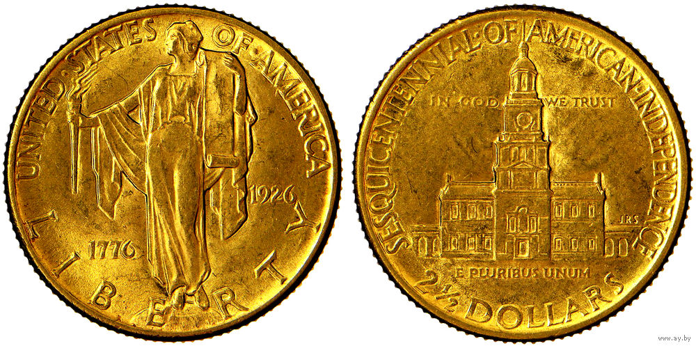 2,5 доллара 1926 г. «150 лет независимости Америки». США. Превосходное состояние, штемпельный блеск. Редкие. Тираж 46 019 шт. Золото. КМ# 161