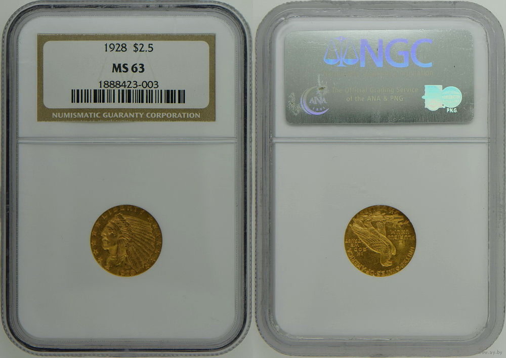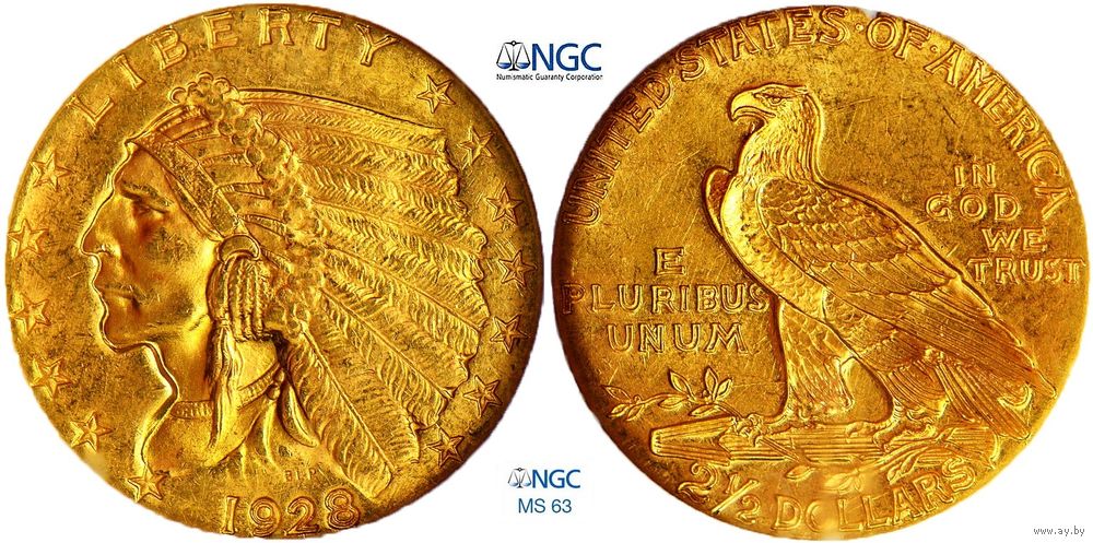2,5 доллара 1928 г. Голова индейца. США. NGC MS 63. Золото. КМ# 128.