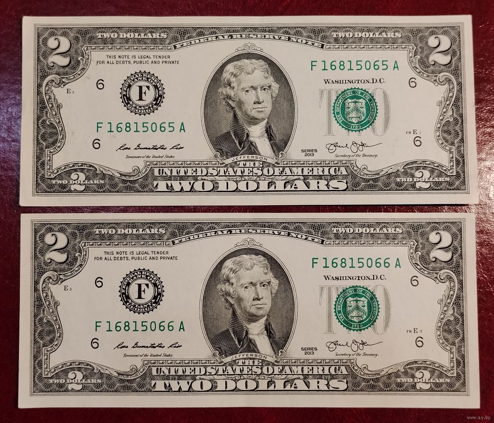 2 доллара 2013 г. Две банкноты одним лотом. Номера подряд. Продажа возможна по отдельности.