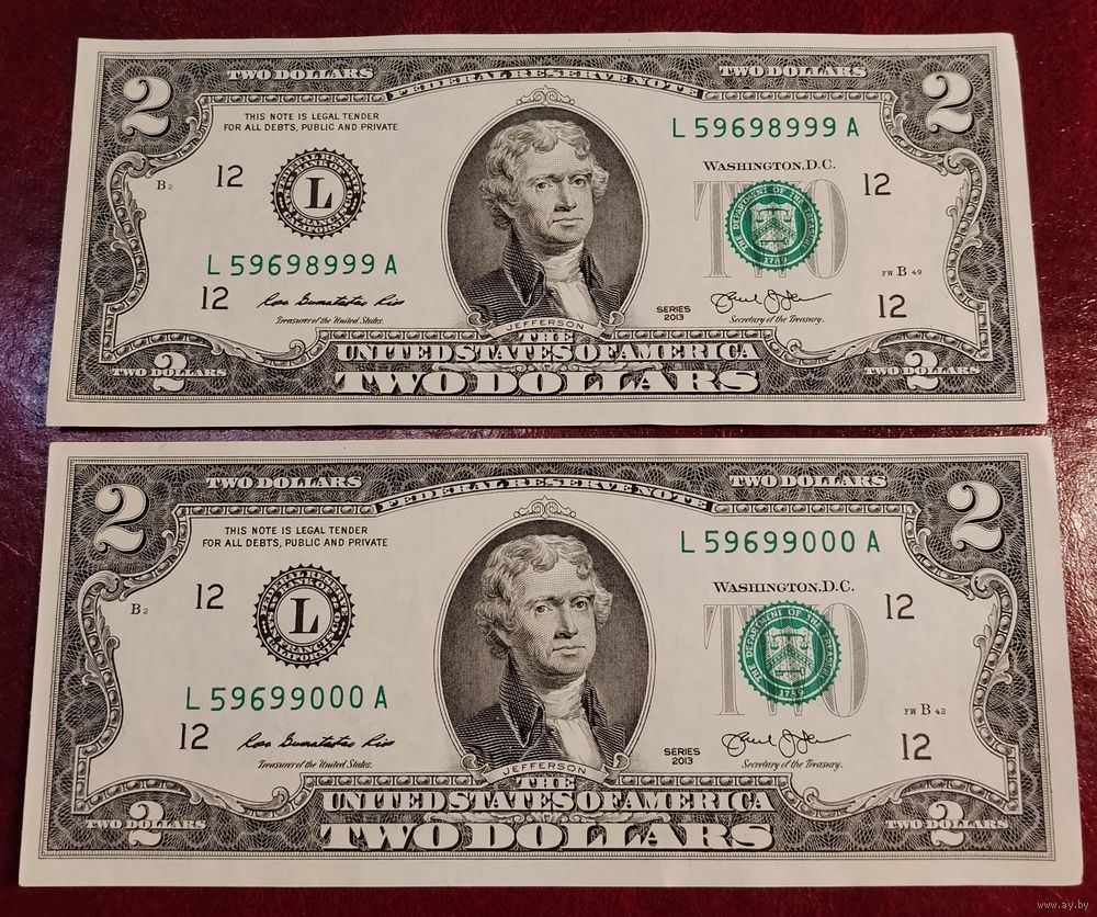 2 доллара 2013 г. Две банкноты одним лотом. Номера подряд. Продажа возможна по отдельности.