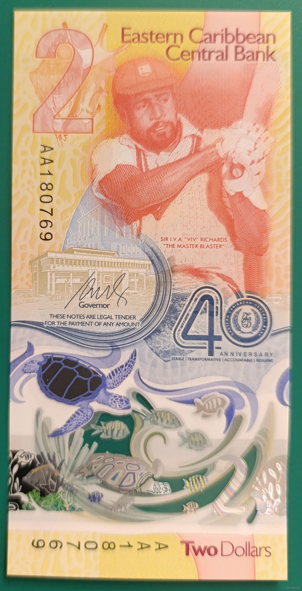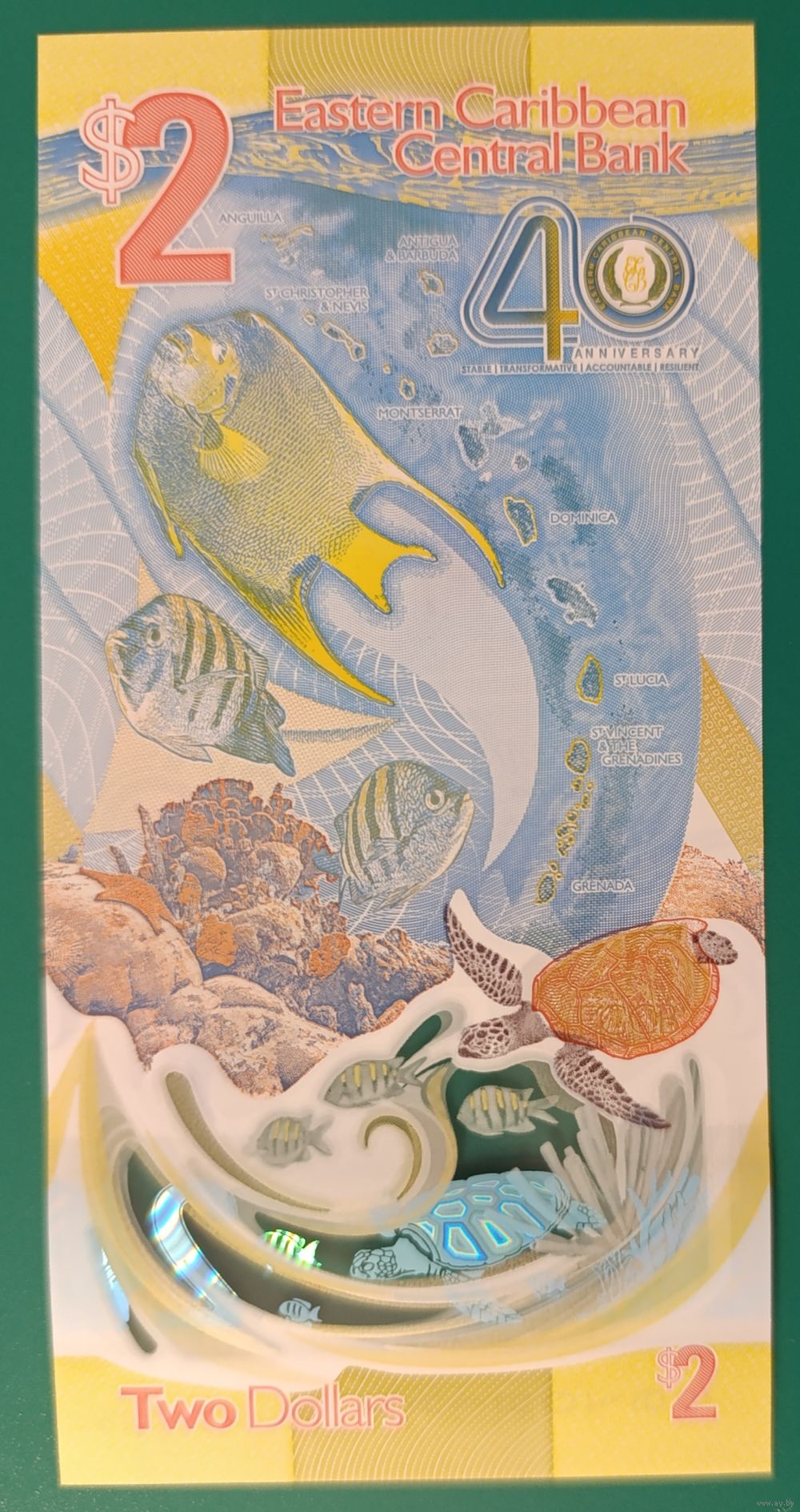 2 доллара 2023 (2024) - полимер - Восточные Карибы - UNC - 40 лет Центральному банку