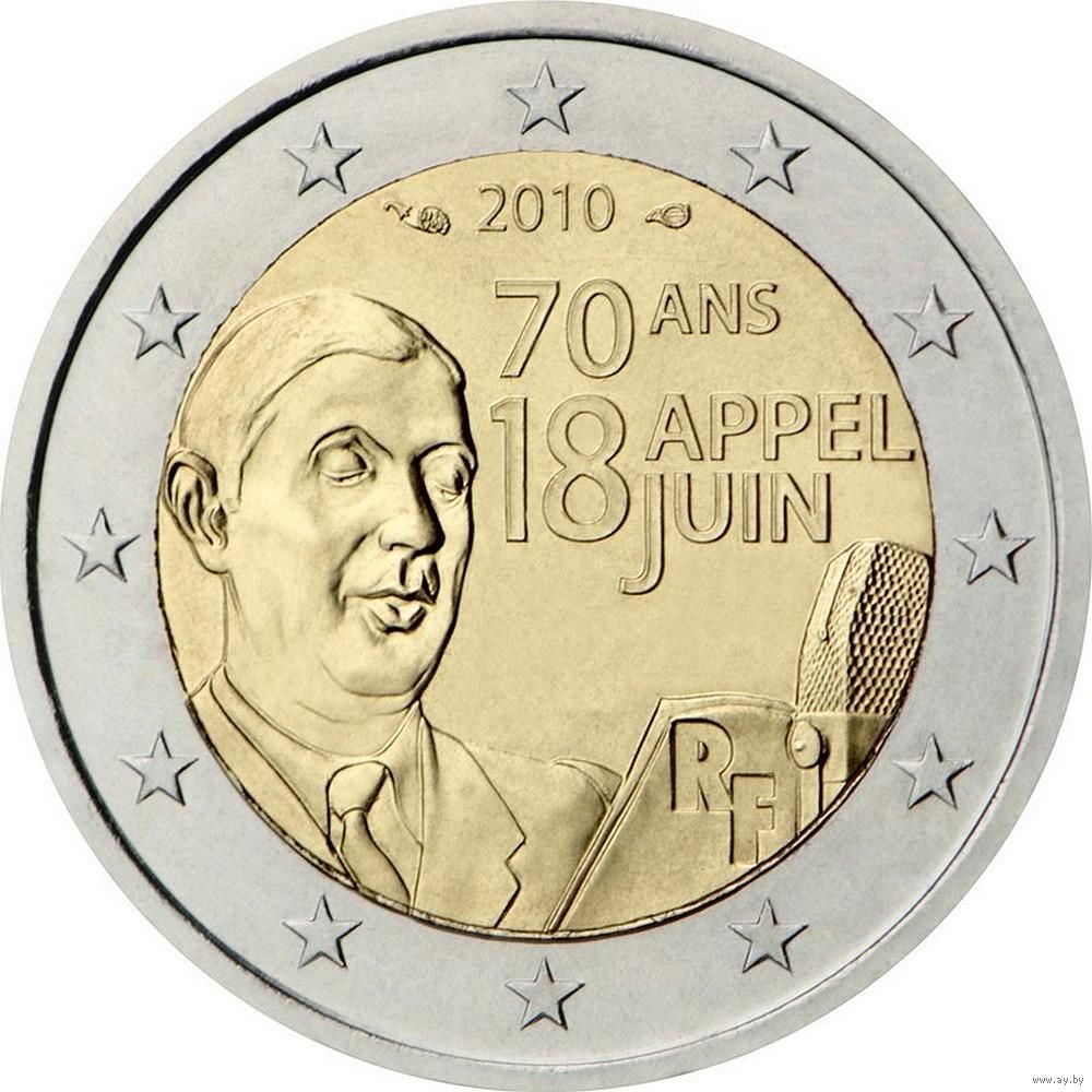 2 евро 2010 Франция 70 лет речи Шарля де Голля Ко всем французам UNC из ролла
