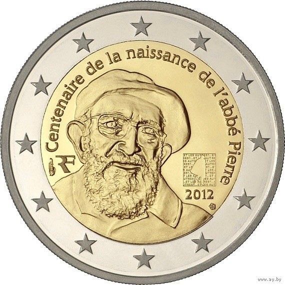 2 евро 2012 Франция 100 лет со дня рождения аббата Пьера UNC из ролла