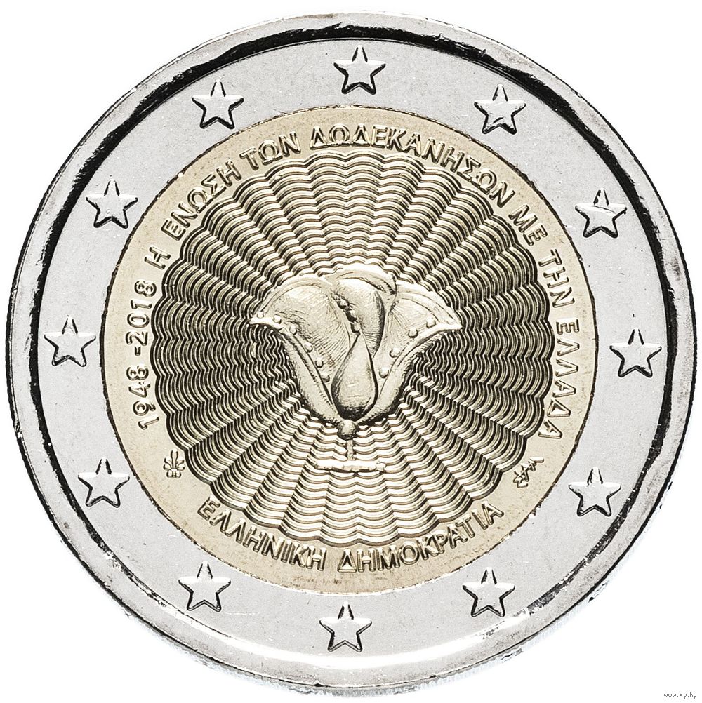 2 евро 2018 Греция 70 лет cоюзу Додеканеса с Грецией UNC из ролла