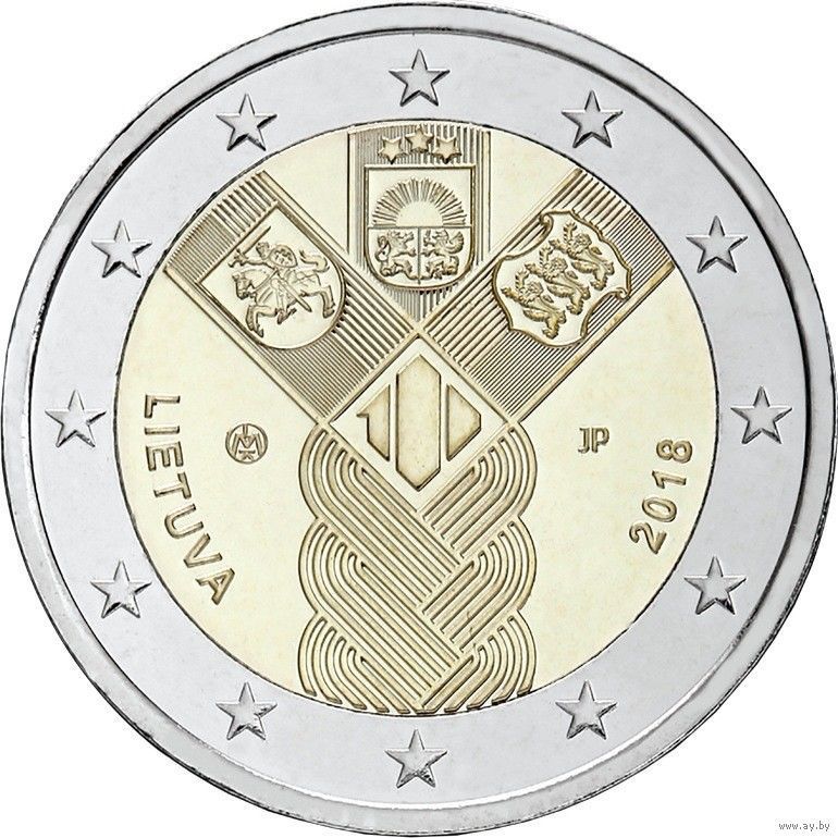 2 евро 2018 Литва 100 лет независимости государств Балтики UNC из ролла