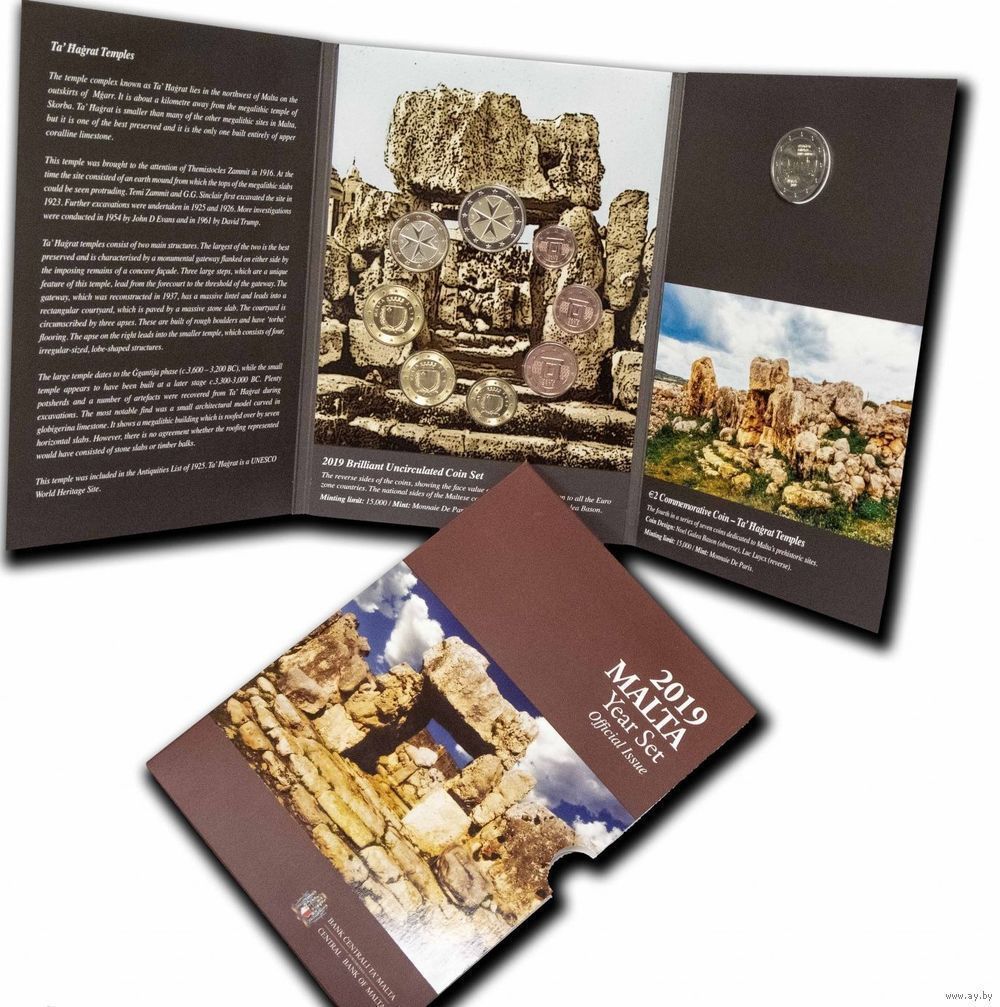 2 евро 2019 Мальта Официальный годовой набор + 2 евро Та Хаджрат BUNC