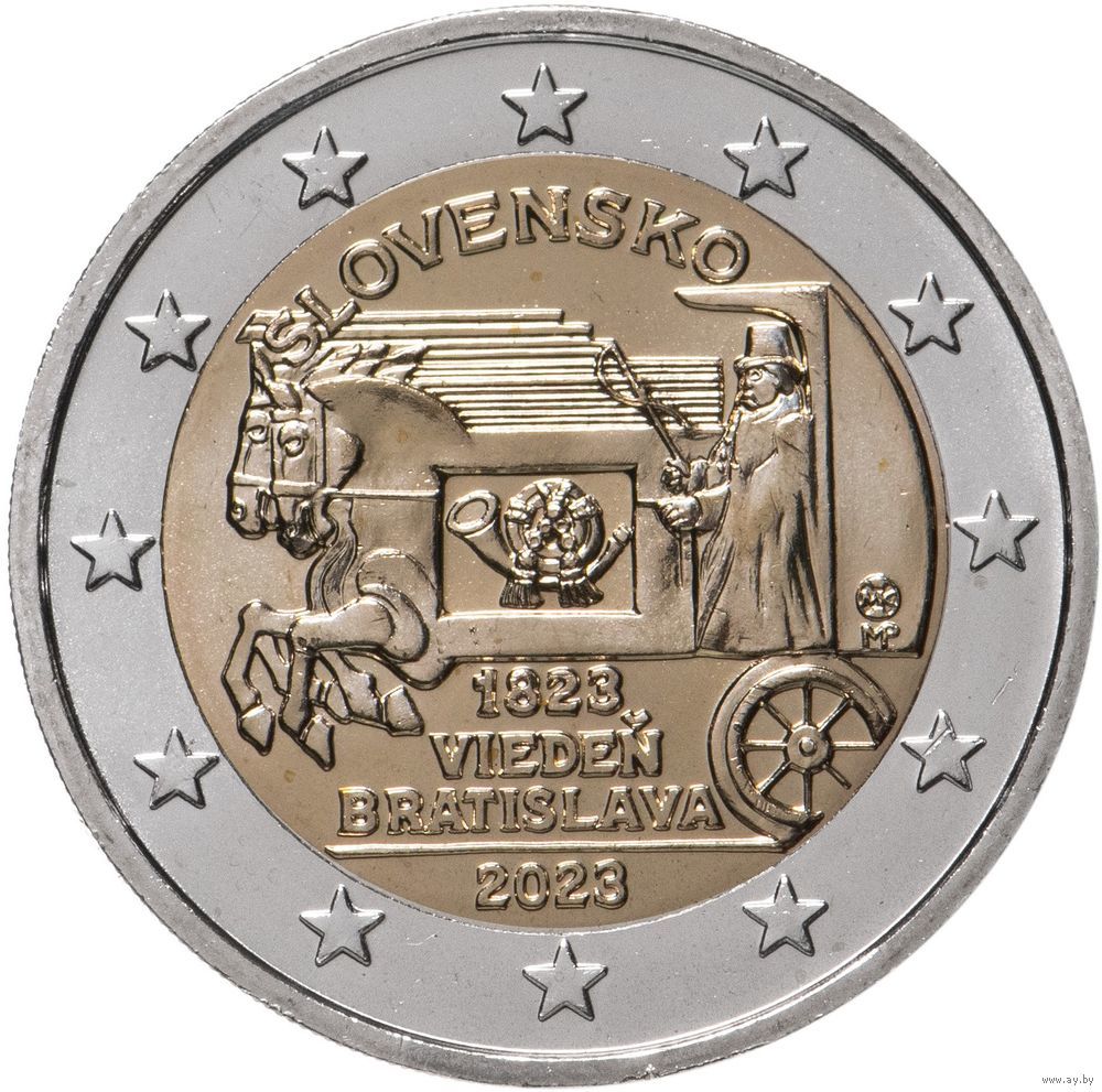 2 евро 2023 Словакия 200 лет со дня открытия конной почты на маршруте Вена-Братислава UNC из ролла
