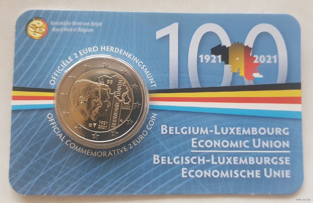 2 евро Бельгия 2021 100 лет Бельгийско-Люксембургскому экономическому союзу в блистере