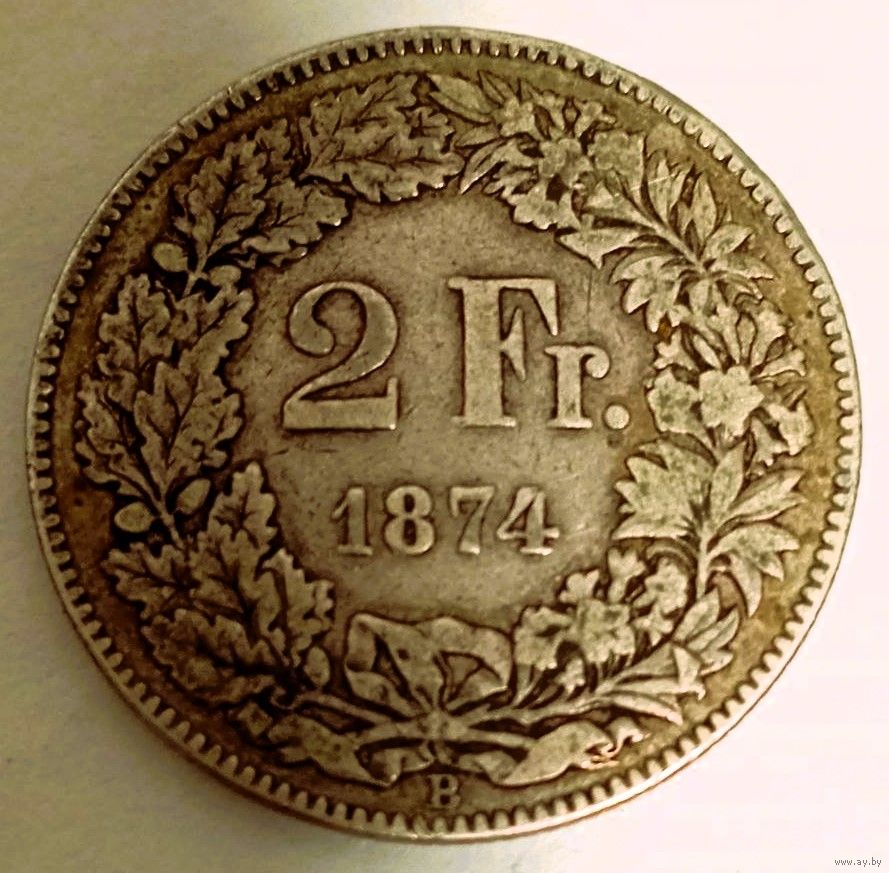 2 франка 1874, Швейцария, вес монеты 10г, серебро, интересная монетка для коллекции! Продается близко к цене металла! Серебро растет!