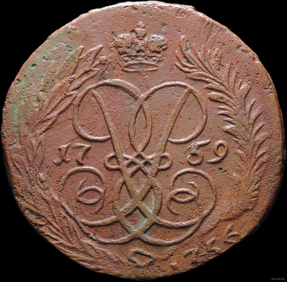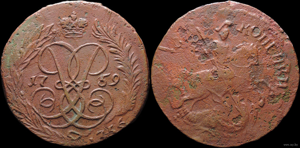 2 копейки 1759, гурт ЕКБ, Номинал сверху! Красивый перечекан - две даты! С 1 Рубля! Смотрите другие лоты!