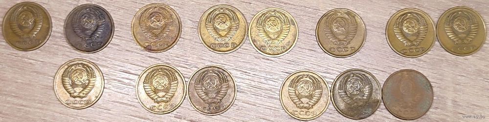 Описание реверса: Штемпель Ф-117. Штемпель А, цифра номинала, венок и колосья отдалены от выступающего канта. Штемпель Б, цифра номинала, венок и колосья приближены к выступающему канту. Штемпель Ф-121,Ф-122,Ф-123. Штемпель А, зерна колосьев округлые, выпуклые. Штемпель Б, зерна колосьев ромбовидные, уплощенные. Штемпель Ф-126. Штемпель А, цифры даты тонкие (ЛМД). Штемпель Б, цифры даты толстые (ММД)