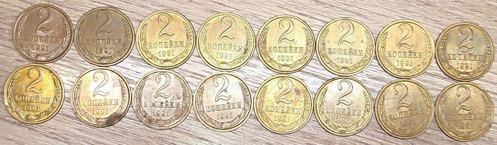 - Монета номиналом 2 копейки 1991 Л СССР в количестве - 16шт (все немагнитные)